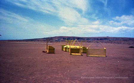 Negative image of a group of jaw boxes and a mesh box on hardpan at an unidentified location.