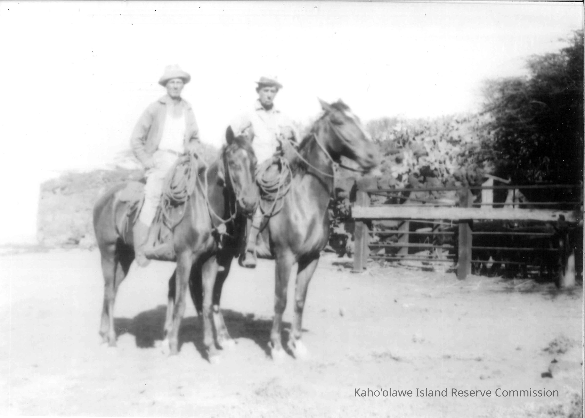 Digital image of black & white print of Joe Medeiros and Antone Freitas on horseback along side of Kaho'olawe cattle shipping pens.Photograph Details