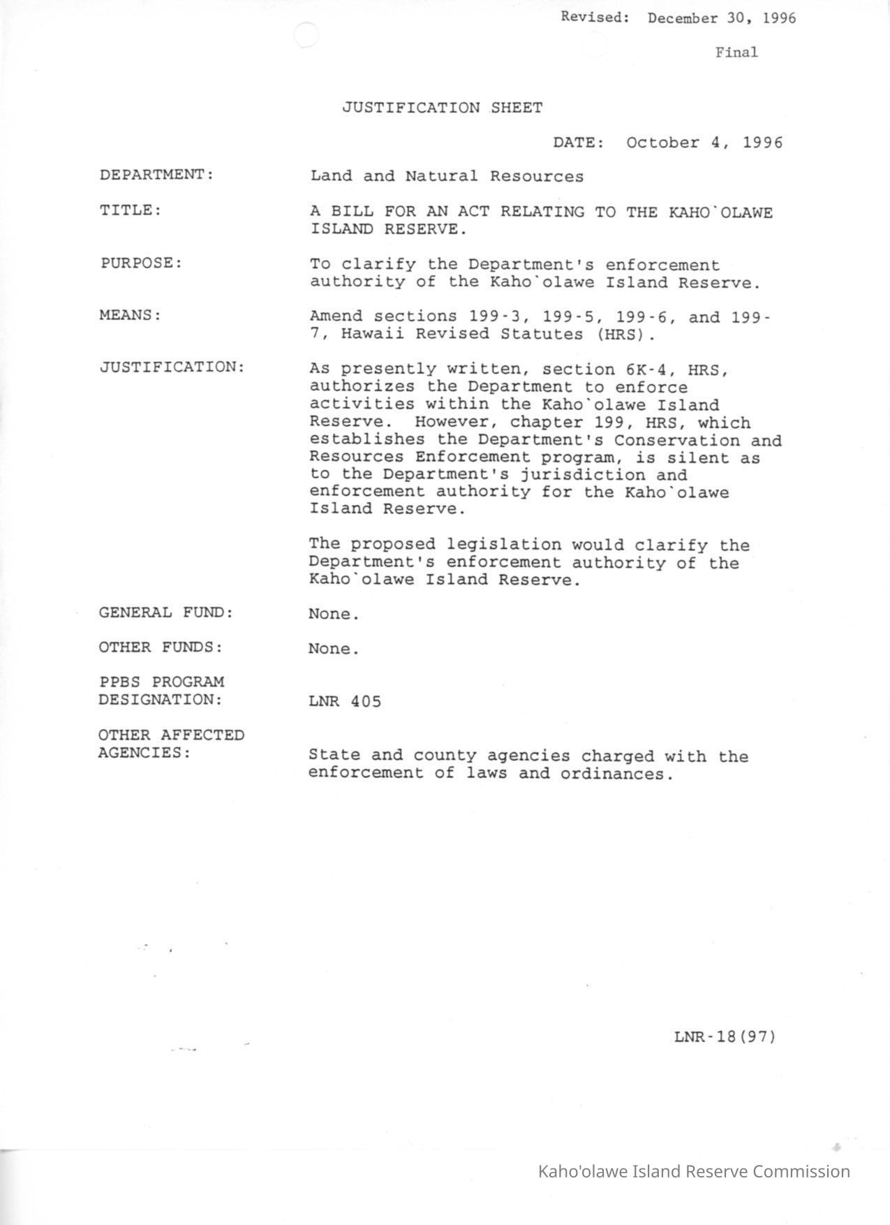 Justification Sheet dated October 4, 1996 revised December 30, 1996-final for A Bill for an Act Relating to the Kaho'olawe Island Reserve.Collection