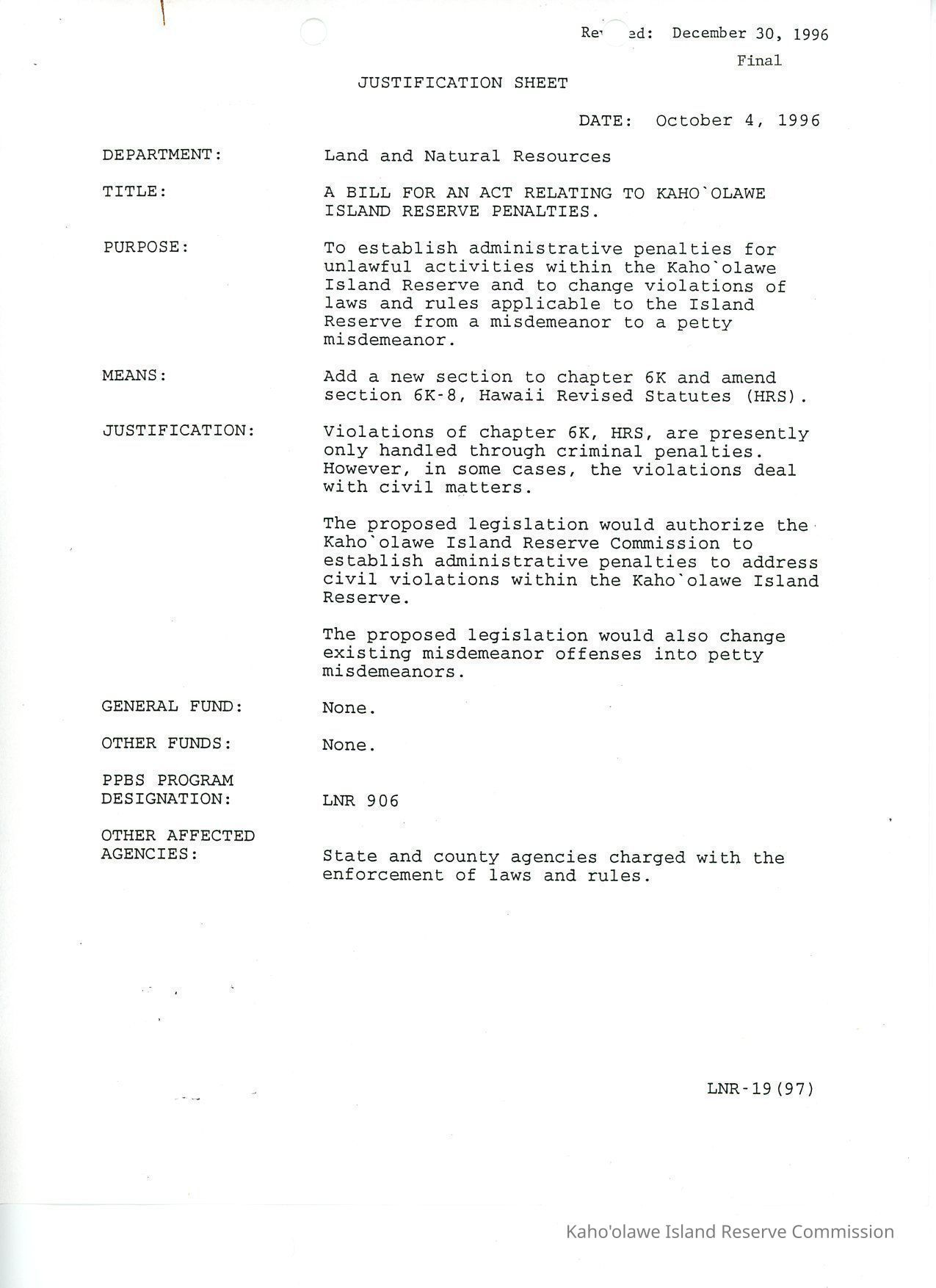 Justification Sheet dated October 4, 1996 revised December 30, 1996-final for A Bill for an Act Relating to Kaho'olawe Island Reserve Penaties.Date(s) of Creation