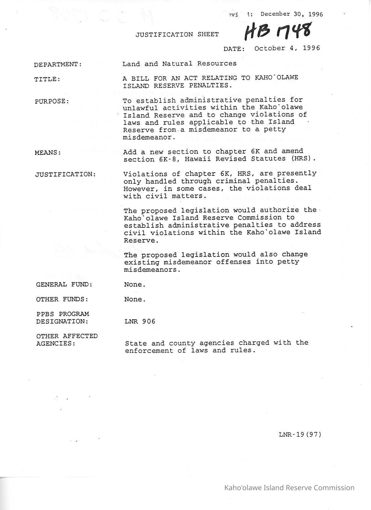 Justification Sheet for HB 1748 "A Bill for an Act Relating to Kaho'olawe Island Reserve Penalties." Copied with H.B. 1748, A Bill for an Act. Document lists purpose, means, justification, general fund, other funds & other affected agencies. Excerpt: "Purpose: to establish administrative penalties for unlawful activities within the Kaho'olawe Island Reserve and to change violations of laws and rules applicable to the Island Reserve from misdemeanor to a petty misdemeanor."Collection