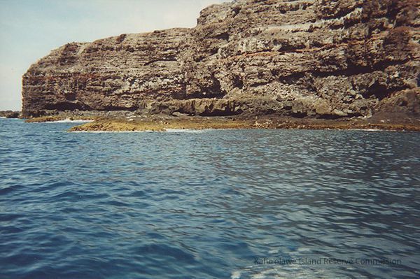 Color photo of Kaho'olawe coastline taken from the ocean.
