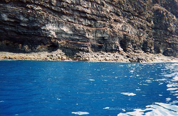 Color closeup photo of a portion of the Kaho'olawe coastline from the ocean.