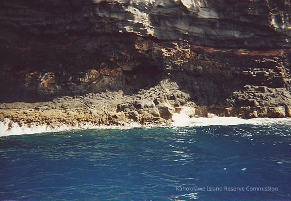 Color close up photo of a rocky coastline on Kaho'olawe. Photo from a boat on the ocean.