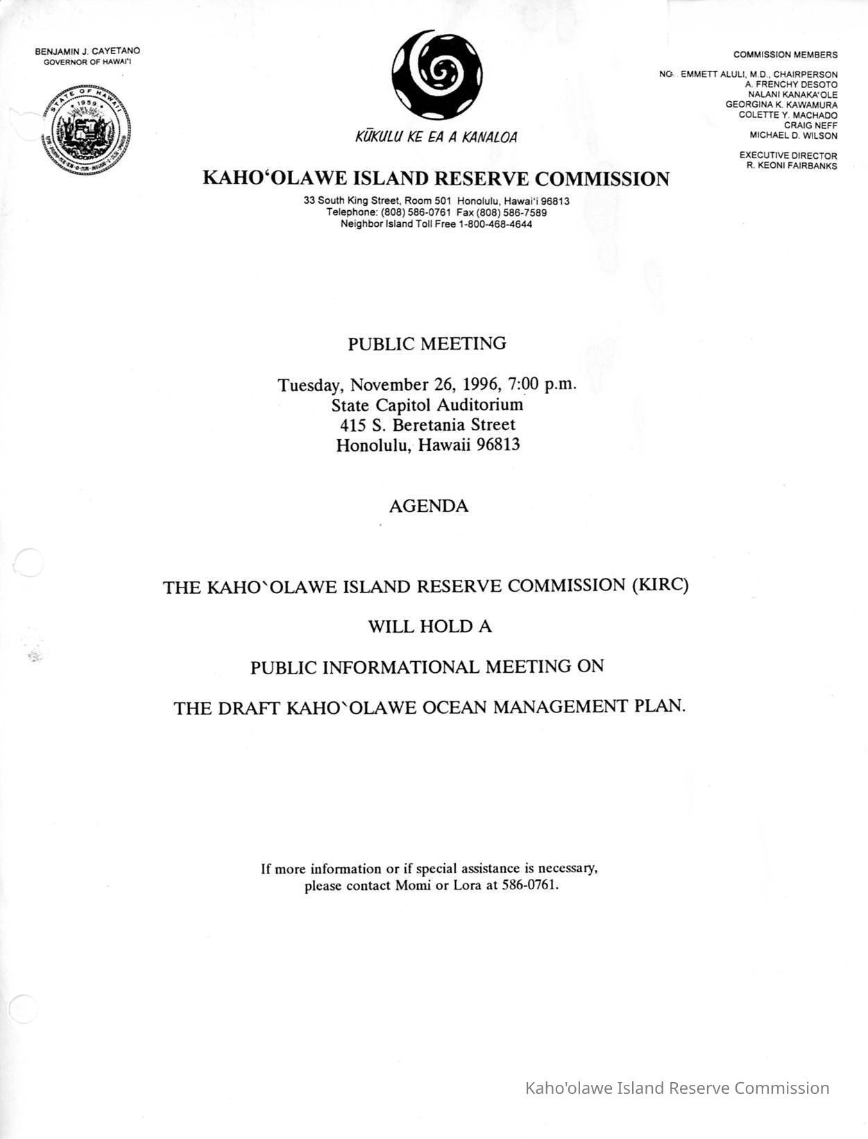 Kaho'olawe Island Reserve Commission Public Meeting Agenda, November 26, 1996Description