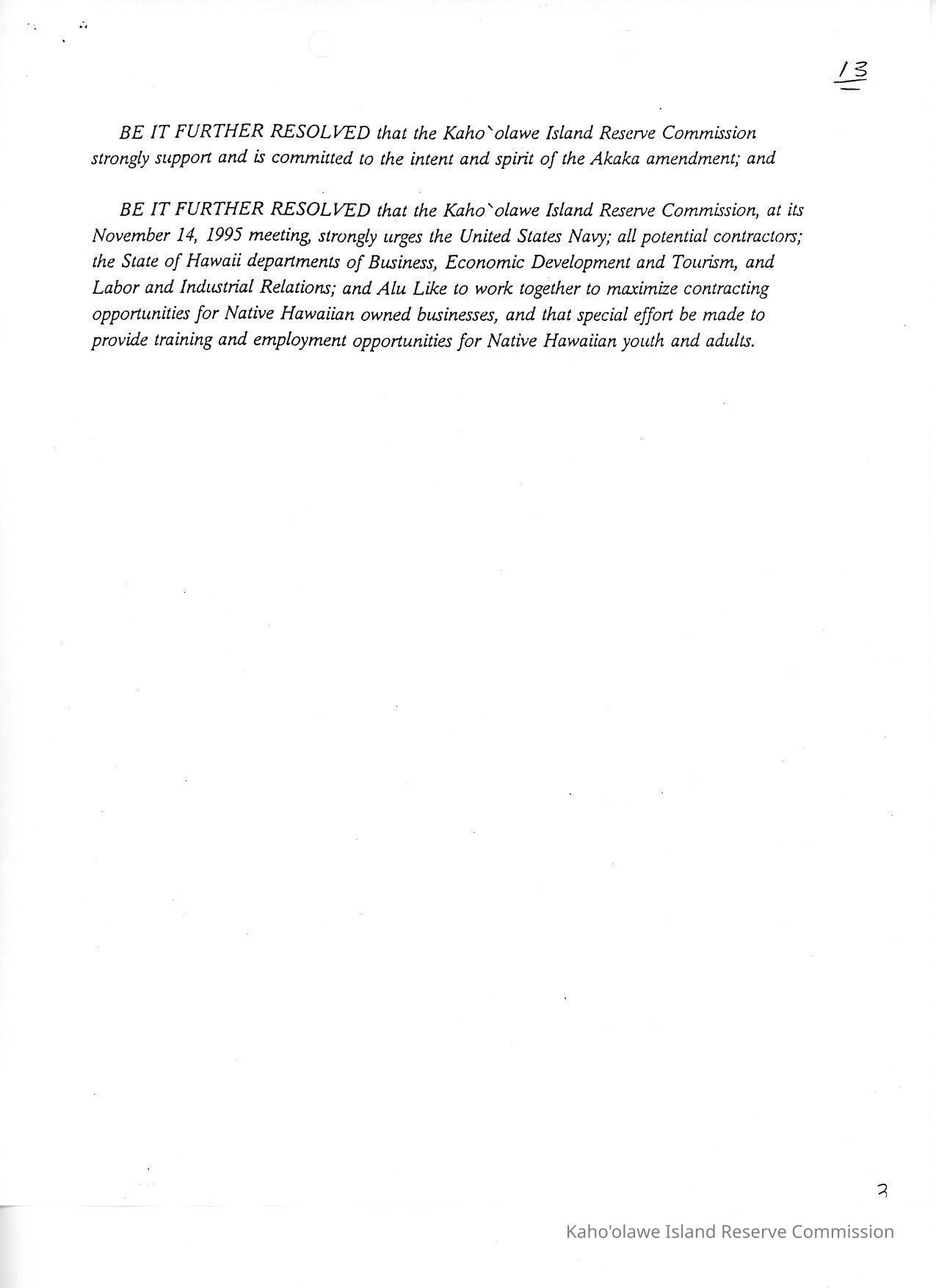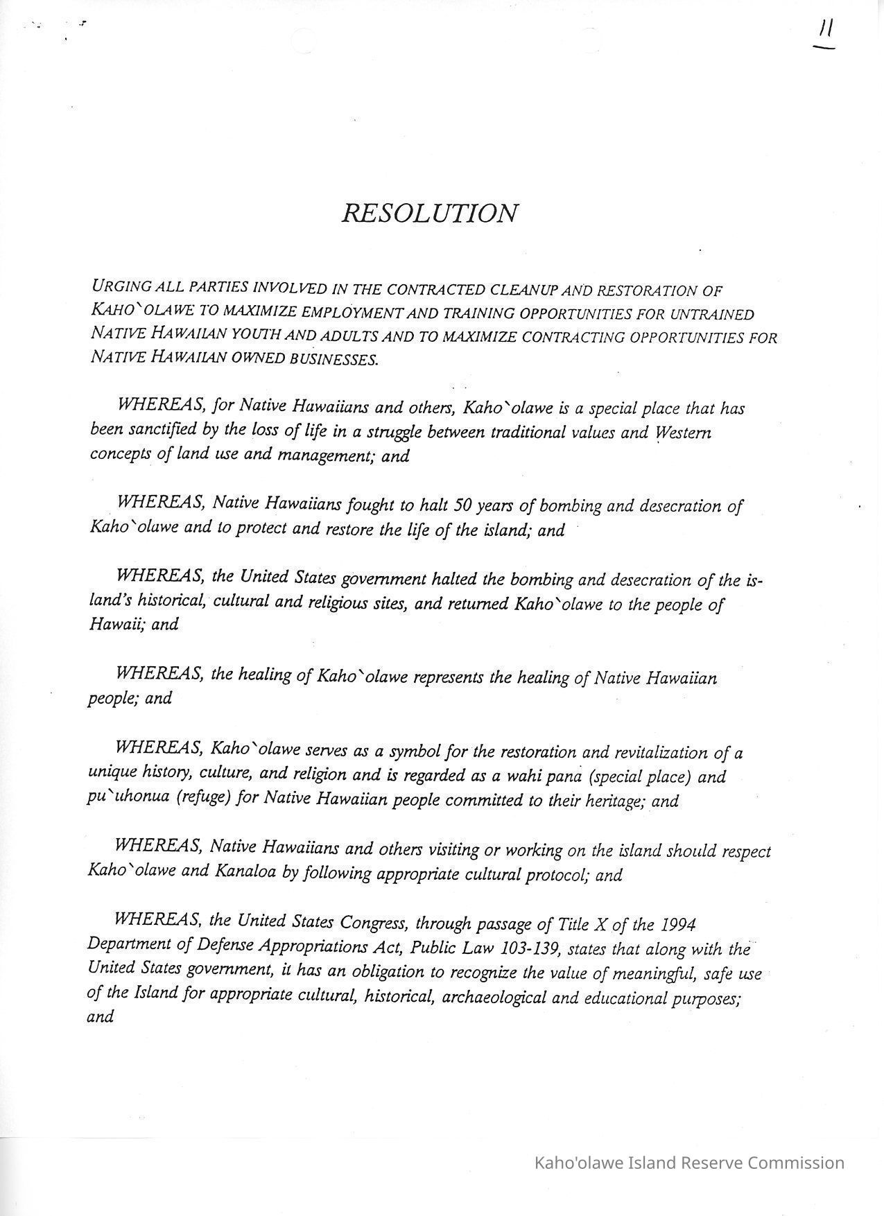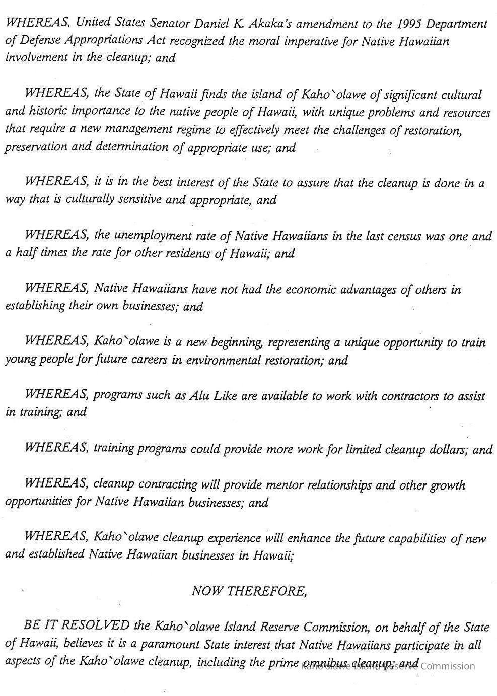 Resolution by the KIRC Urging all parties involved in the contracted cleanup and restoration of Kaho'olawe to maximize employment and training opportunities for untrained Native Hawaiian Youth and Adults and to Maximize Contracting Opportunities for Native Hawaiian Owned Businesses. Three letter sized copied pages.Creator