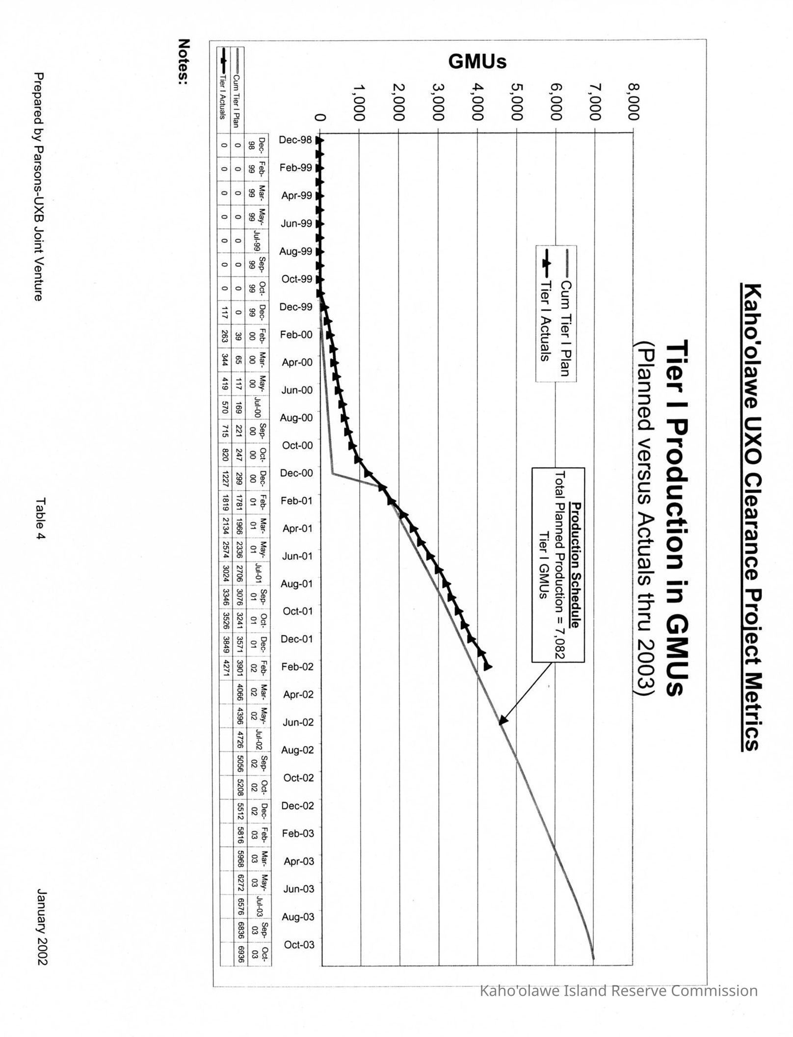 Copy of Kaho'olawe UXO Clearance Project Metrics, Tier I Production in GMUs (Planned versus Actuals thru 2003). One black & white copied page.Creator