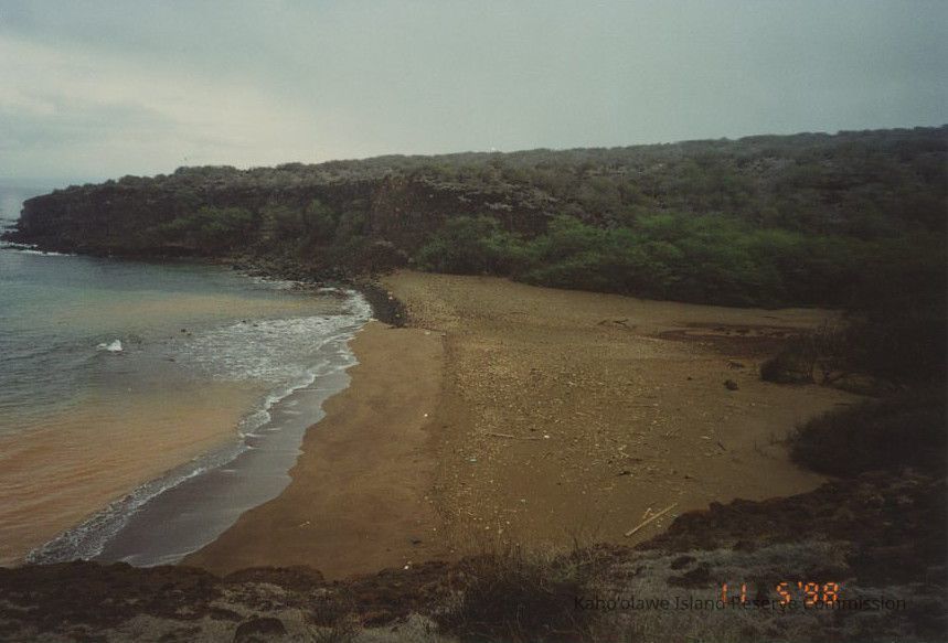 The image shows a beach with a wooded cliff and cloudy skies. There is soil runoff off the coastline.