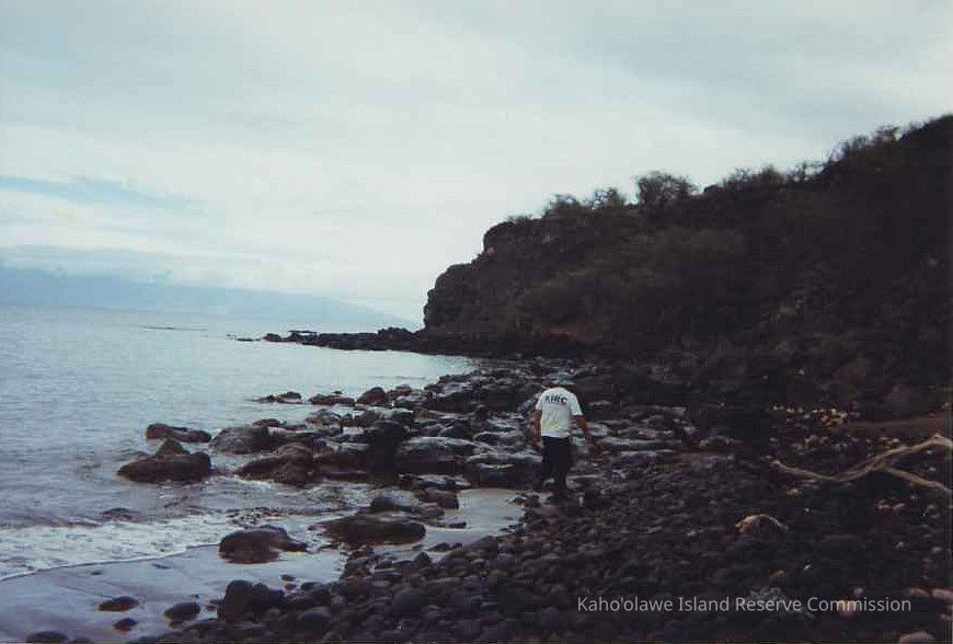 Color photo of an unidentified KIRC staff member (possibly Charles Lindsey) walking along the rocky shoreline at Kaulana.