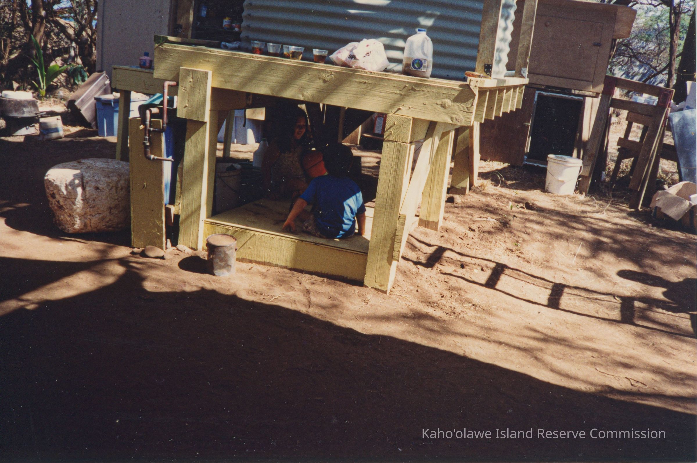 Color photograph of two unidentified keiki (children) sitting under a wooden work table with a water catchment structure on top. This photo may have been taken in Hakioawa.