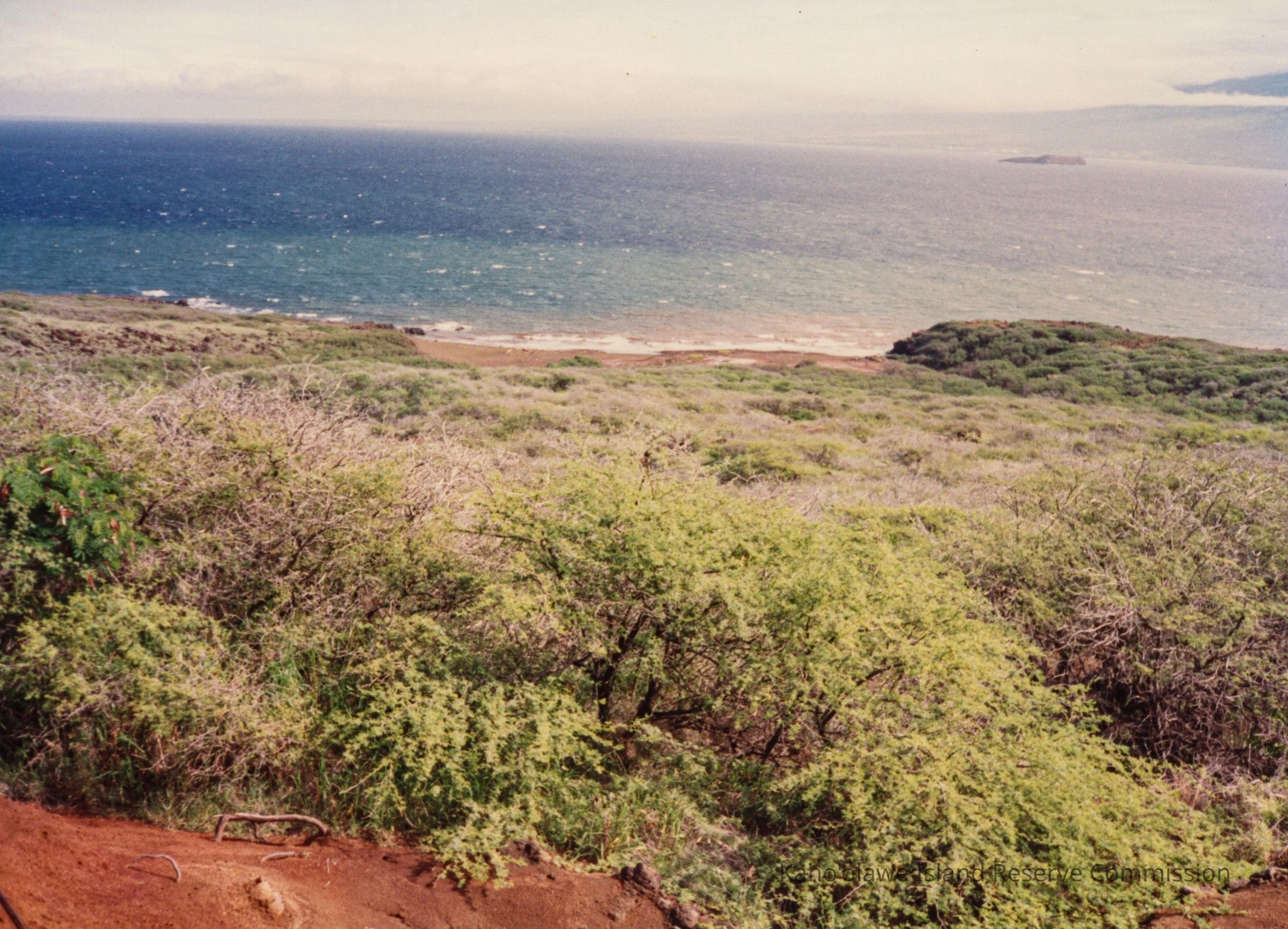 Color photograph of kiawe (algaroba, Prosopis pallida) trees with a sandy beach, white-capped ocean and Molokini in the far background.