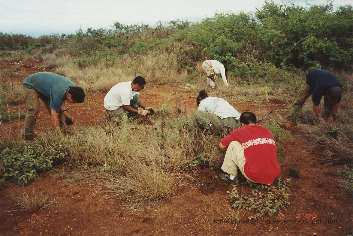 Color photo of several unidentified KIRC volunteers planting in Luamakika.