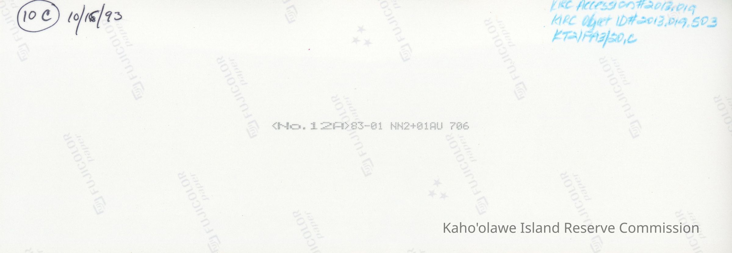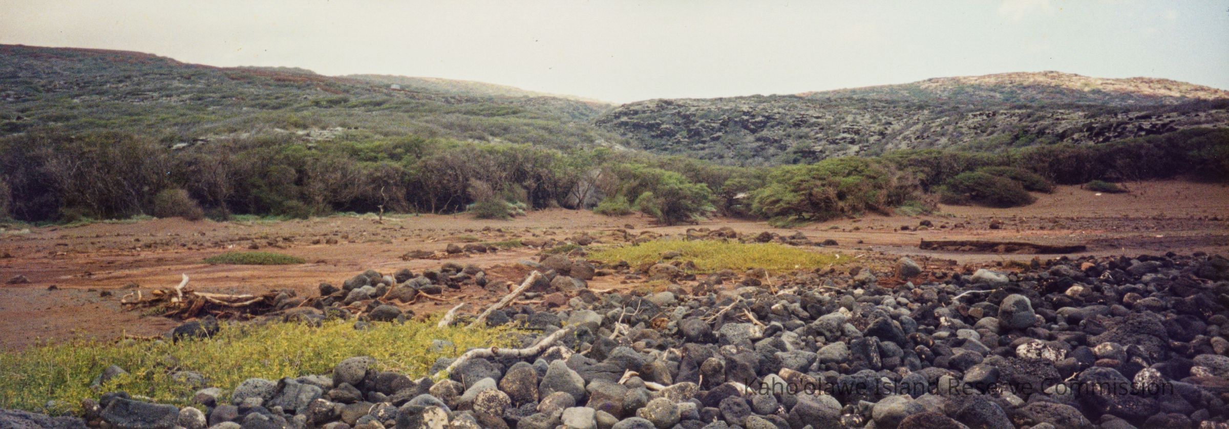 Panoramic color photograph of a landscape with a potential dry streambed in the center, rocks and flowering plants in the forefront. Kiawe trees line its bank on the other side with bluffs in the far background. The number "10C" and either 10/15/93 or 10/15/93 (the 5 and 6 overlap) are handwritten in the back.Photograph Details