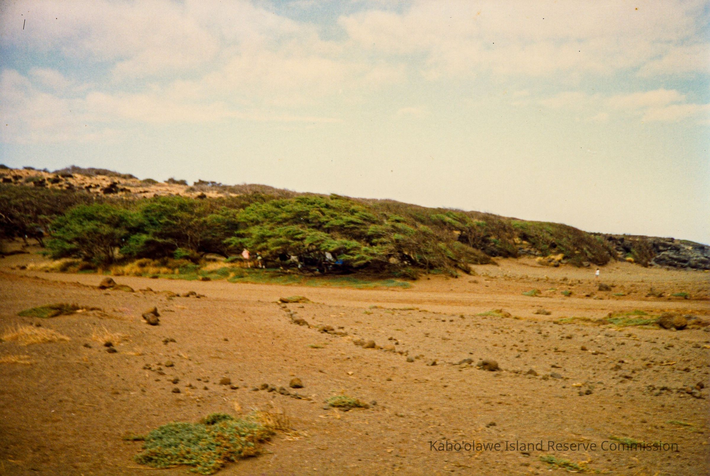 Color photograph of sandy, semi-rocky terrain with a group of people standing underneath a group of trees. This photo may have been taken in Hakioawa, Kaho'olawe.Photograph Details