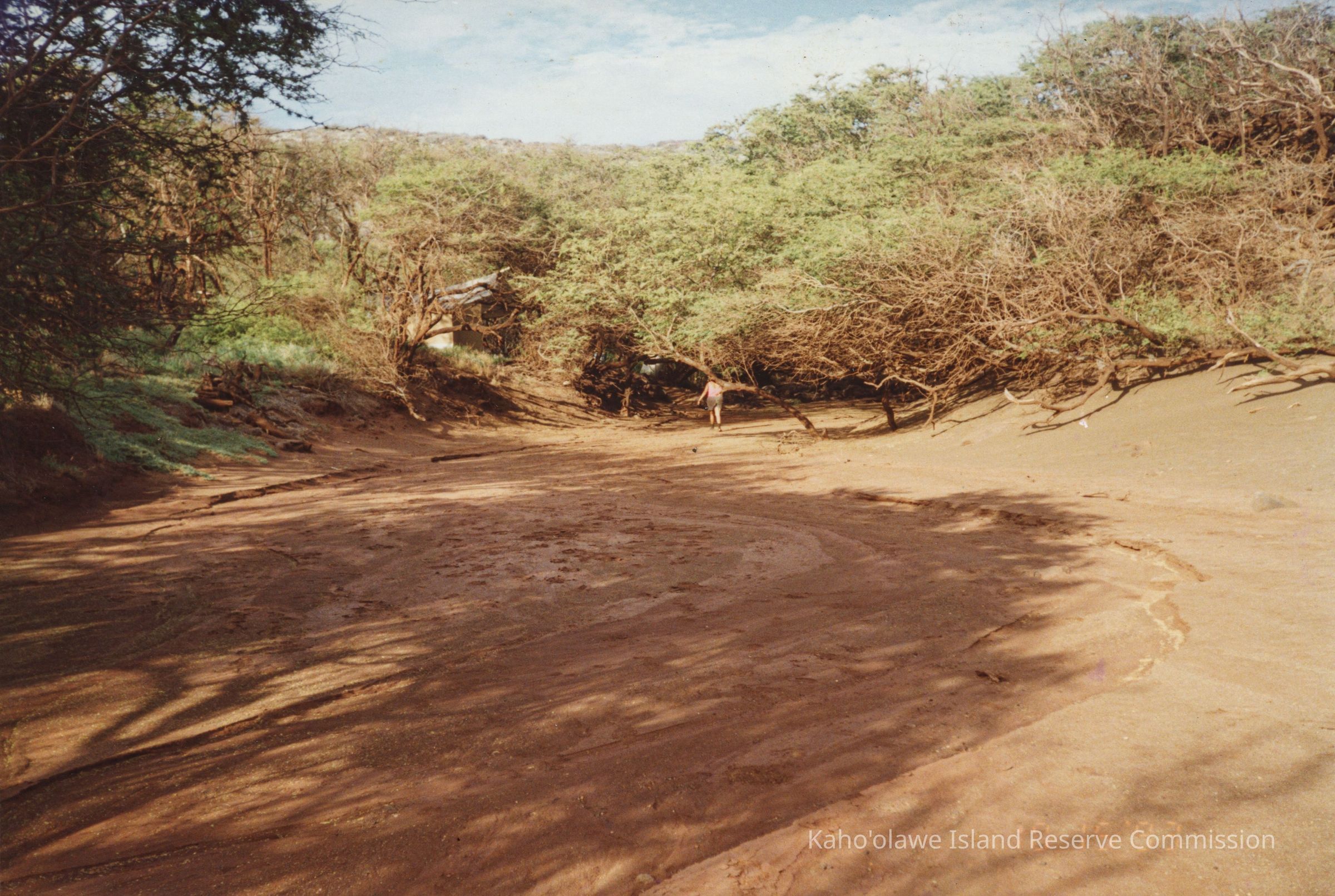 Color image of a flat area (possibly a dry streambed) semi-surrounded by kiawe trees. There is an unidentified person walking towards a structure amongst trees in the far background. The number 1 and 10/15/93 are handwritten in black ink on the back of photo.