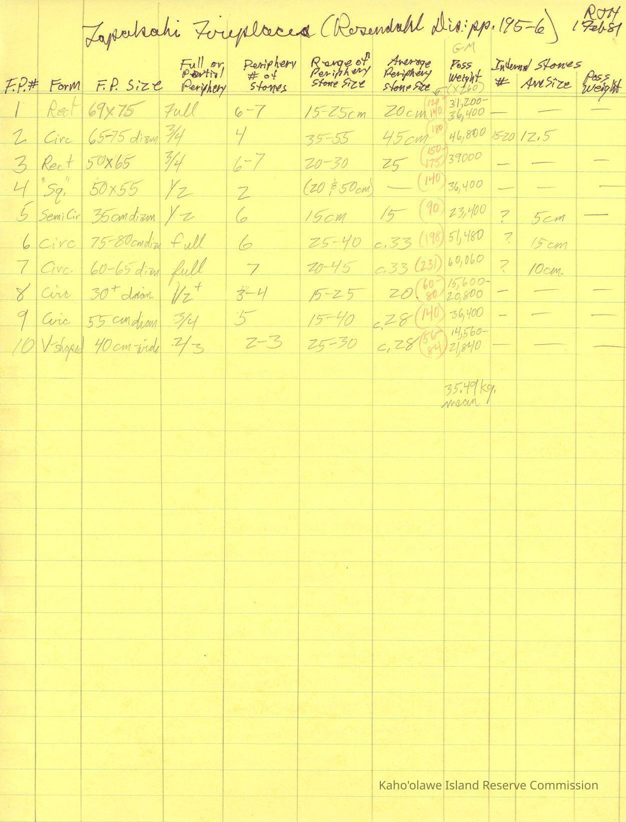 List of Lapakahi Fireplaces based on Rosendahl Dic: pp. 195-6 & one copied page from an unknown report. 1 yellow-lined page & 1 repograhic black and white copied pageCreator