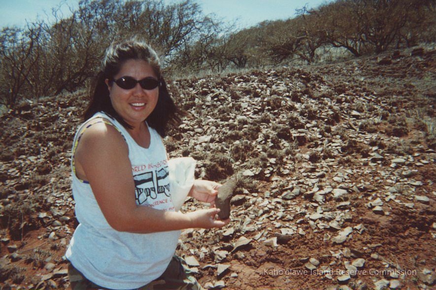 Lei Ishikawa holding up an artifact at Puumoiwi.