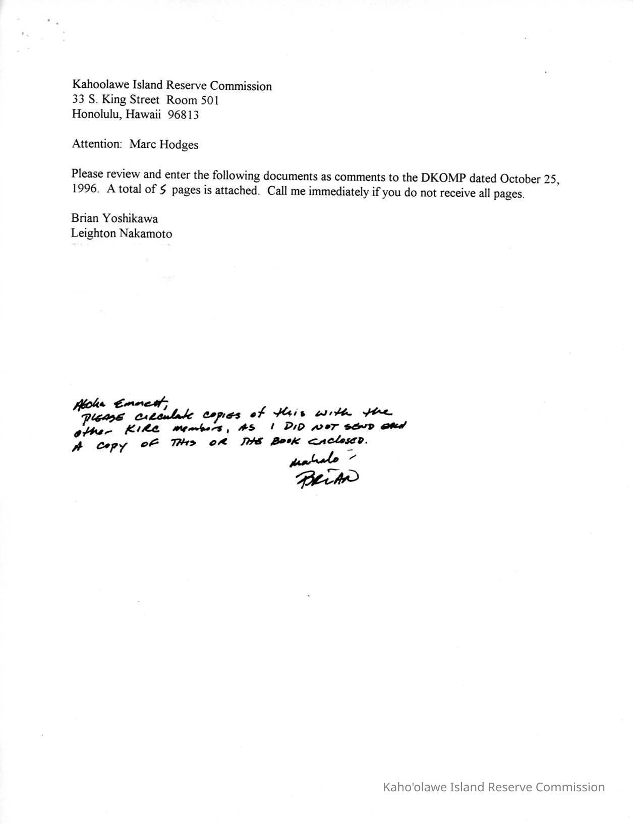 Letter to Kahoolawe Island Reserve Commission, attention to Marc Hodges regarding comments to the DKOMP (Draft Kahoolawe Ocean Management Plan).