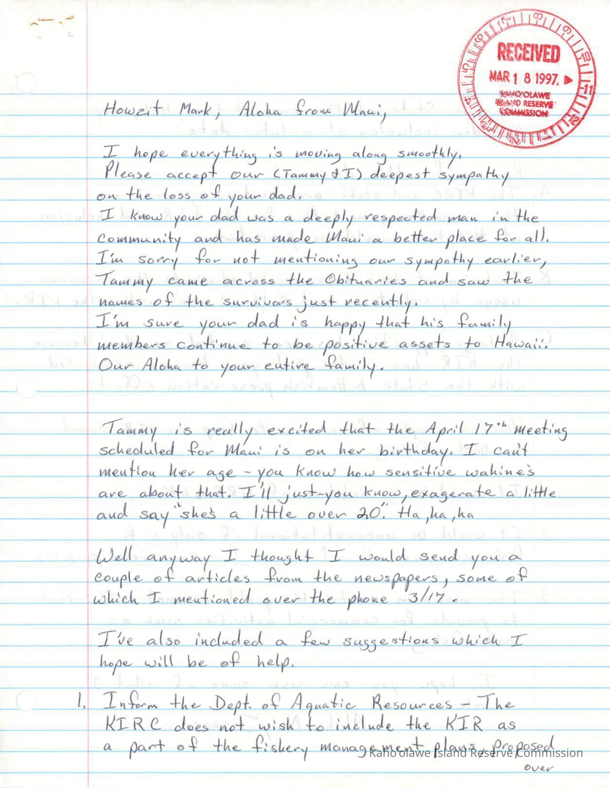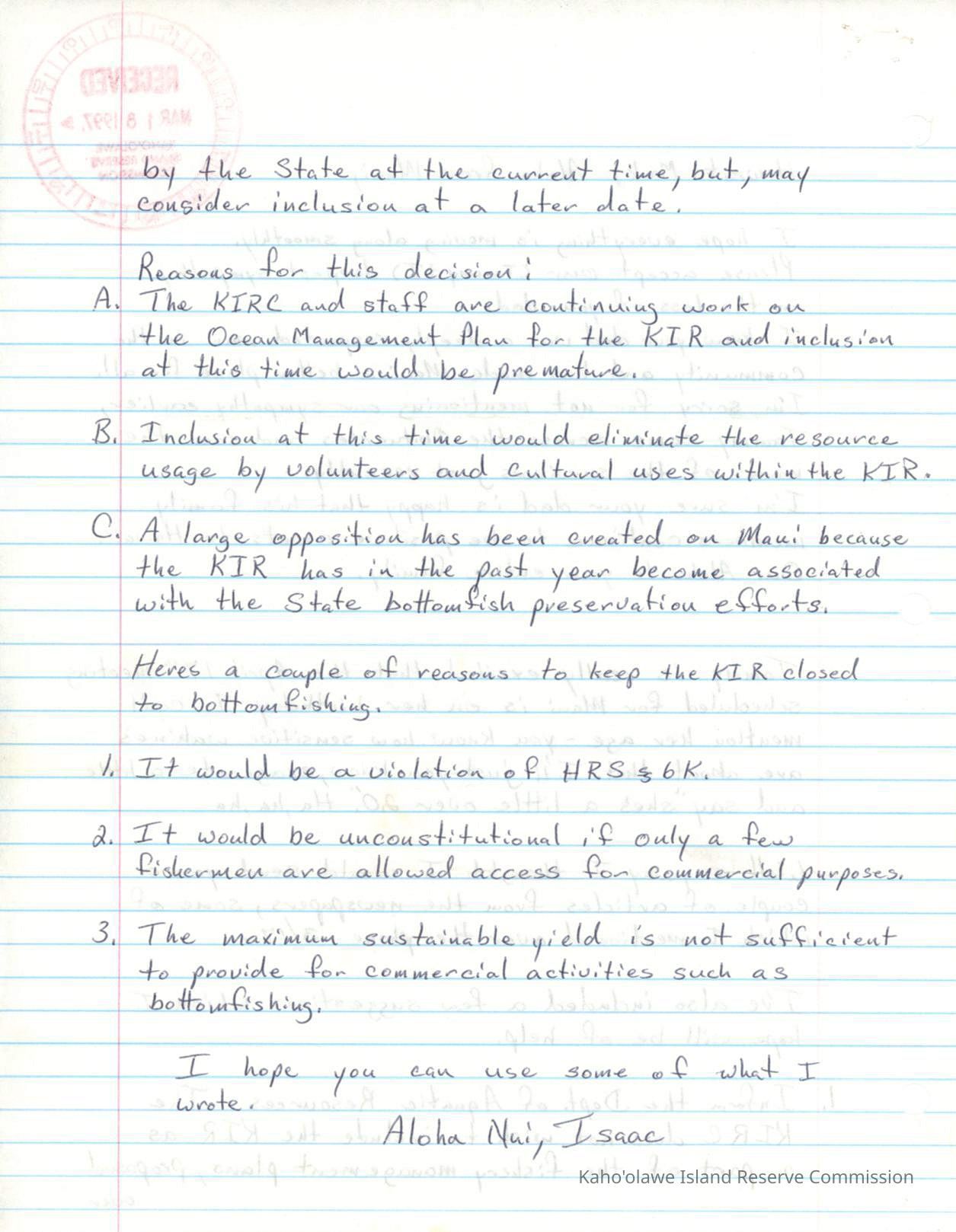 Original handwritten letter (no date) mailed to Marc Hodges from Isaac Harp regarding draft Kahoolawe Ocean Management Plan.
