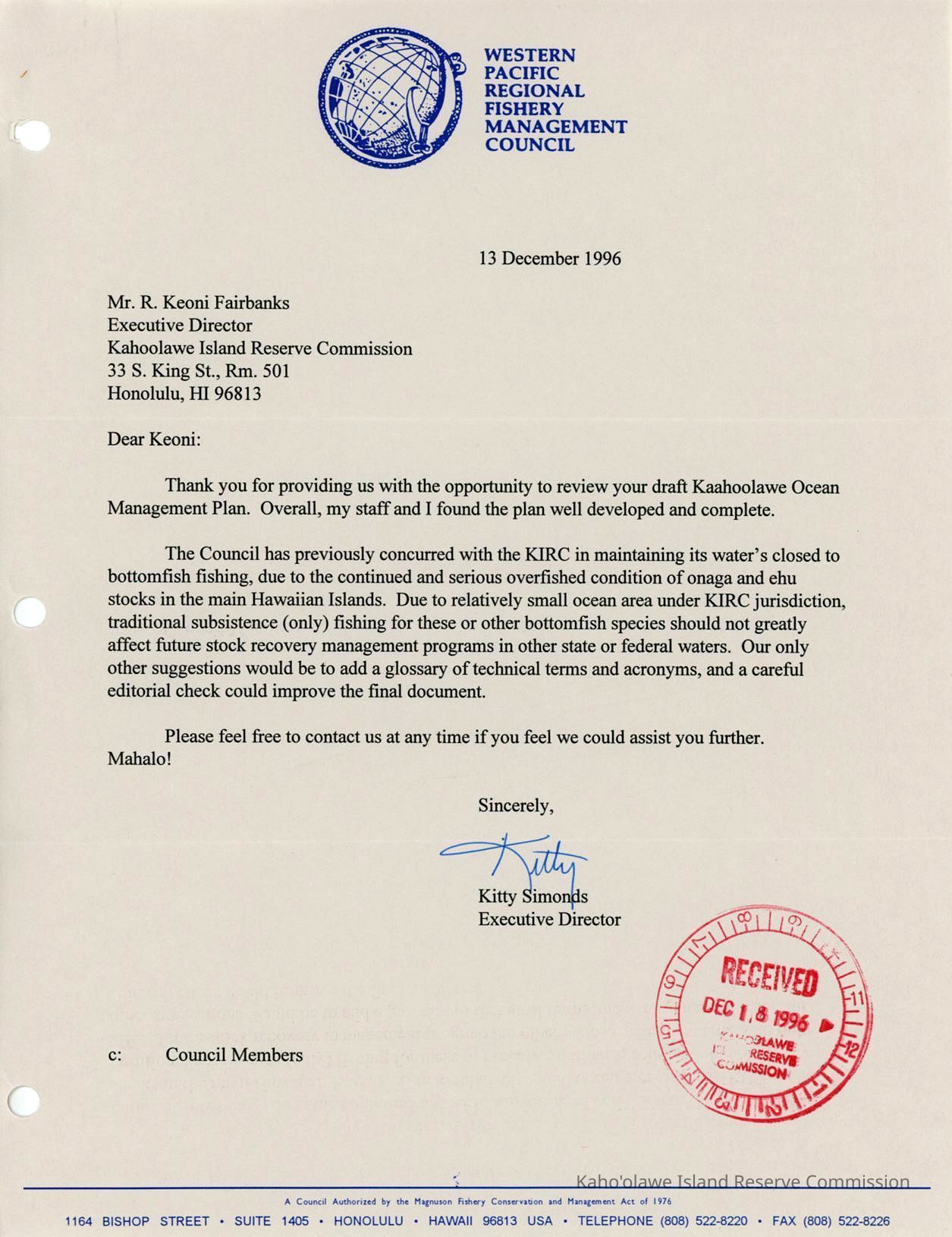 Original letter to R. Keoni Fairbanks, Executive Director, Kahoolawe Island Reserve Commission from Kitty Simonds, Executive Director, Western Pacific Regional Fishery Management Council regarding draft Kahoolawe Ocean Management Plan.