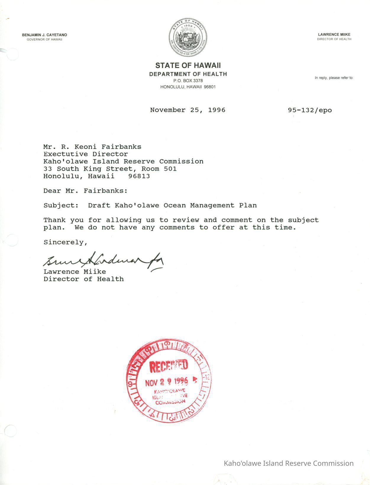 Original letter to Mr. R. Keoni Fairbanks, Executive Director, Kaho'olawe Island Reserve Commission from Lawrence Miike, Director of Health, Department of Health, State of Hawaii.Creator