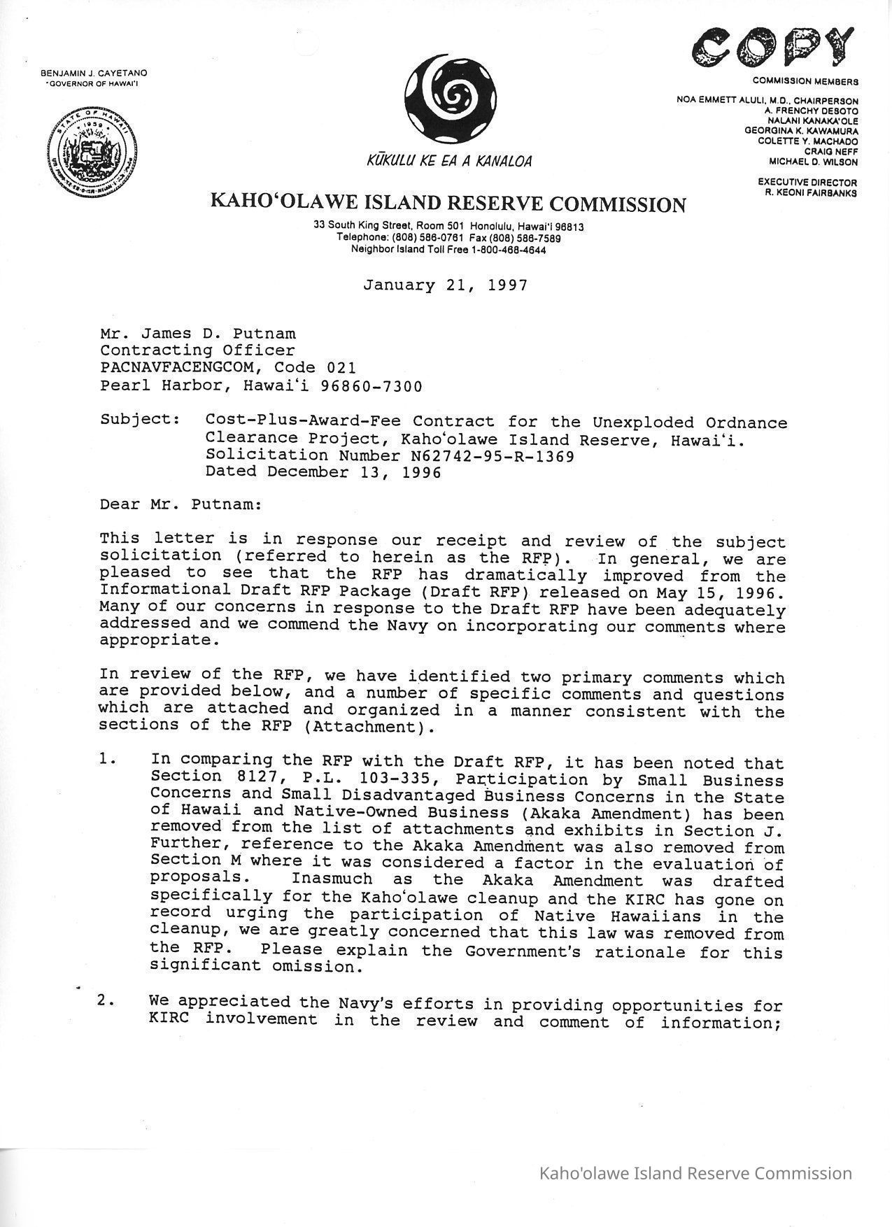 Copy of letter from R. Keoni Fairbanks, Executive Director to Mr. James D. Putnam, Contracting Officer, PACNAVFACENGCOM, Code 021, Pearl Harbor re: Cost-Plus-Award-Fee Contract for the Unexploded Ordnance Clearance Project, Kaho'olawe Island Reserve. This copy was attached to KIRC testimony regarding Senate Resolution No. 14 in 1997.