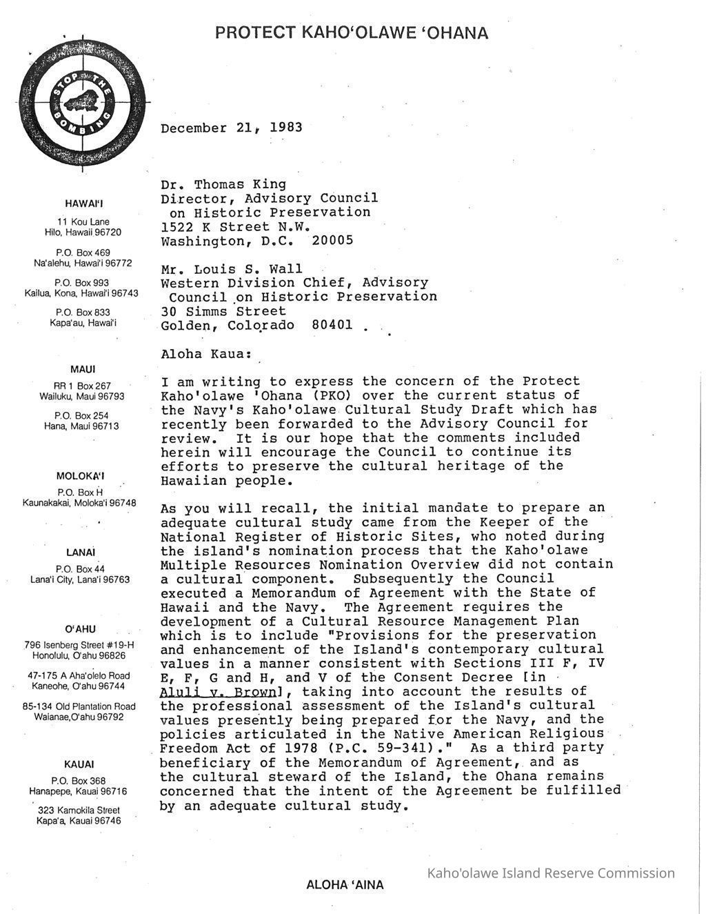 Copy of etter from Dr. Noa Emmett Aluli on behalf of the Protect Kaho'olawe 'Ohana to Dr. Thomas King, Director, Advisory Council on Historic Preservation, and Mr. Louis Wall, Western Division Chief, Advisory Council on Historic Preservation, regarding concern over the current status of the Navy's Kaho'olawe Cultural Study Draft.Collection