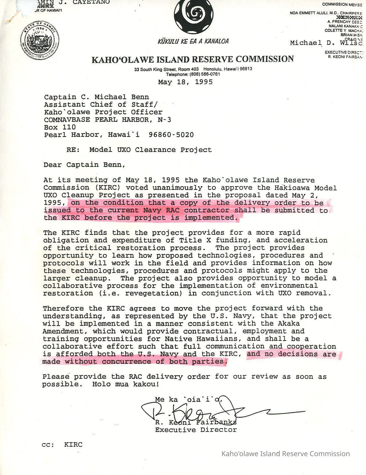 Copy of letter to Captain C. Michael Benn, Assistant Chief of Staff/Kahoolawe Project Officer from R. Keoni Fairbanks, Executive Director regarding Model UXO Clearance Project. Approval of the Hakioawa Model UXO Cleanup Project by the Kahoolawe Island Reserve Commission, "on the condition that a copy of the delivery order to be issued to the current Navy RAC contractor shall be submitted to the KIRC before the project is implemented."