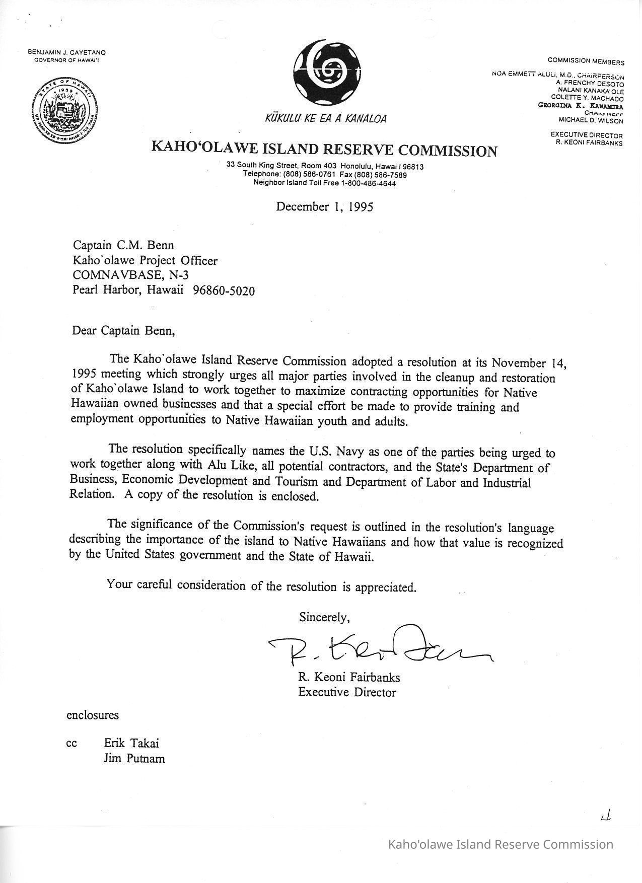Letter to Captain C.M. Benn, Kaho'olawe Project Officer, CONNAVEBASE, Pearl Harbor from R. Keoni Fairbanks, Executive Director regarding consideration of resolution urging maximizing contracting opportunities for Native Hawaiian owned businesses.