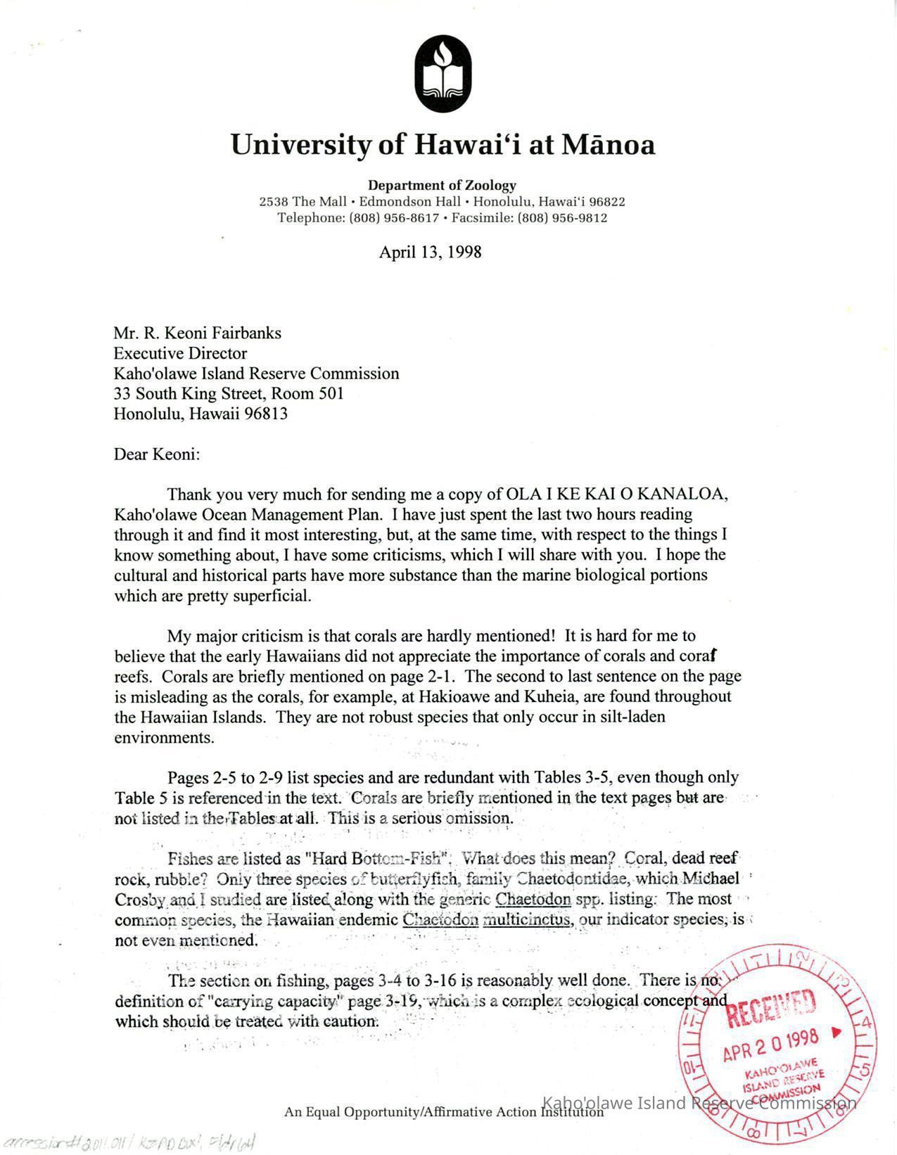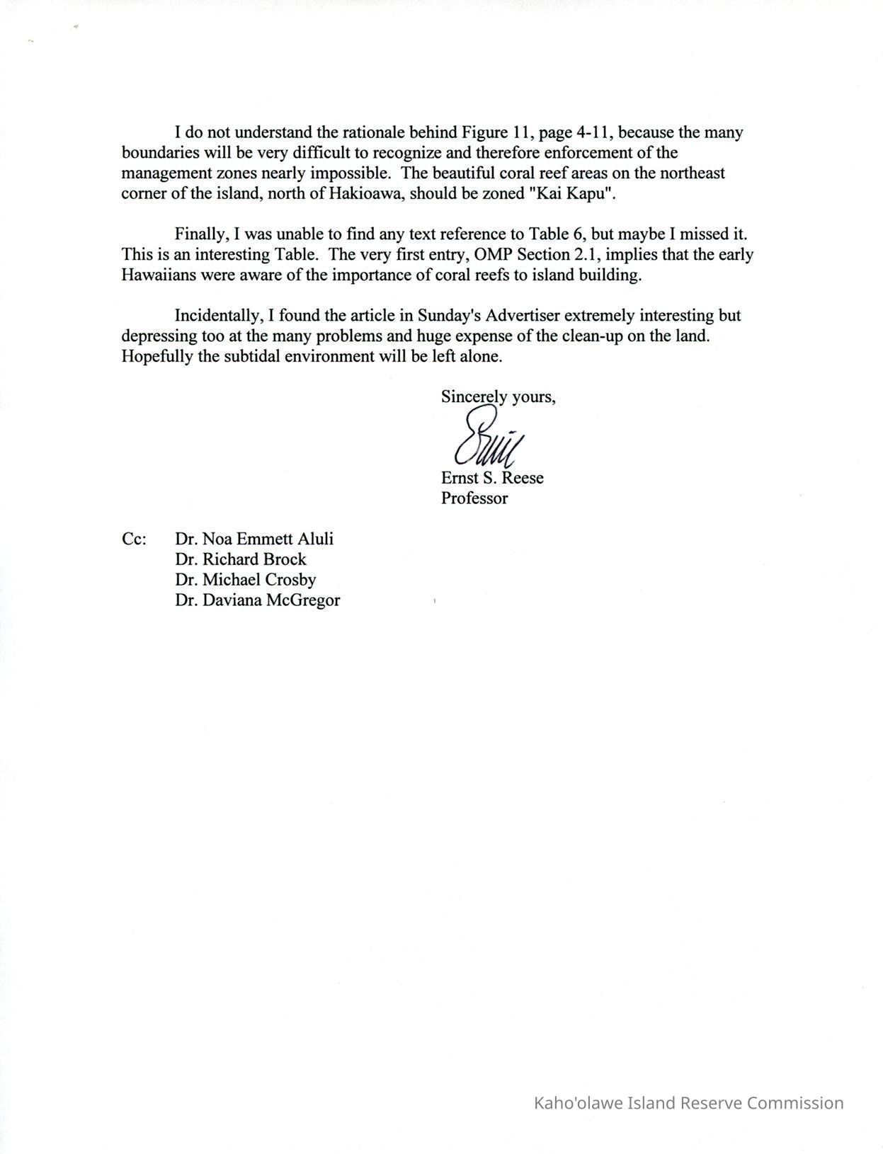 Original letter to Mr. R. Keoni Fairbanks, Executive Director, Kaho'olawe Island Reserve Commission from Ernst S. Reese, Professor, Department of Zoology, University of Hawaii at Manoa re: Ola I Ke Kai O Kanaloa, Kaho'olawe Ocean Management Plan.