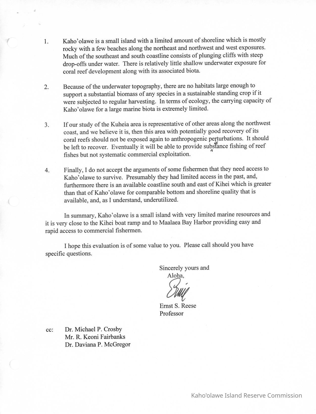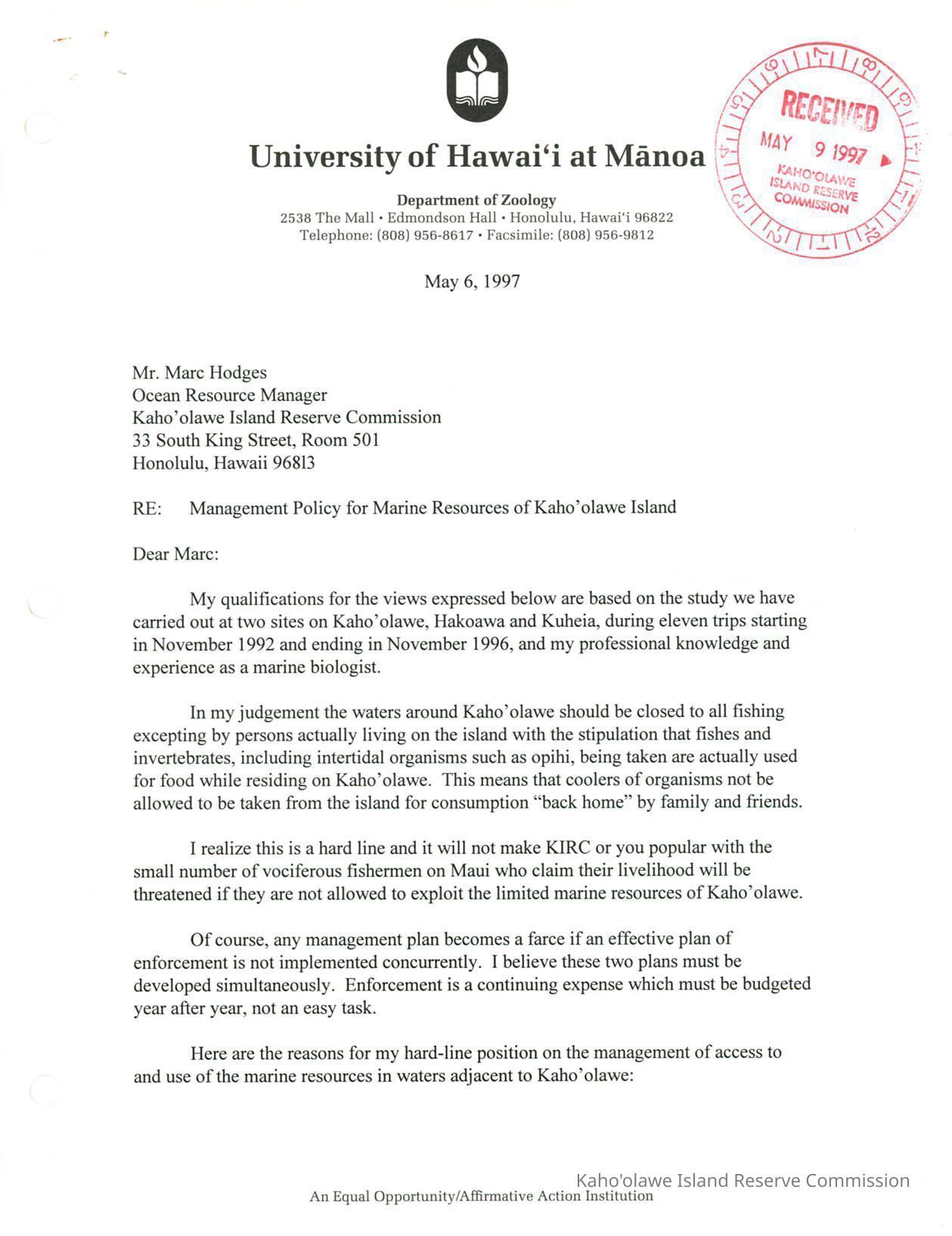 Original letter to Mr. Marc Hodges, Ocean Resource Manager from Ernst S. Reese, Professor, Department of Zoology, University of Hawaii at Manoa regarding management policy for marine resources of Kahoolawe Island.