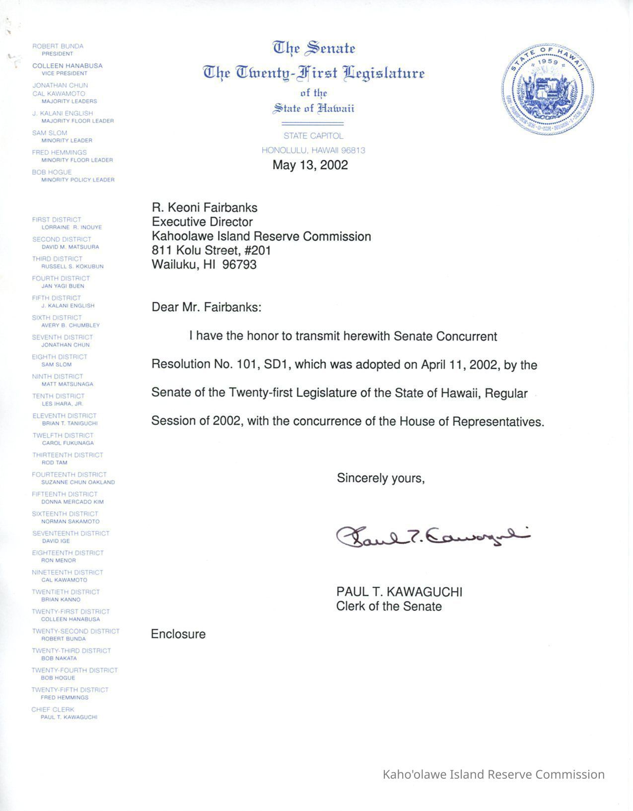 Letter to R. Keoni Fairbanks, Executive Director, Kahoolawe Island Reserve Commission from Paul T. Kawaguchi, Clerk of the Senate re: ransmittal of Senate Concurrent Resolution No. 101, SD1, Urging the Use of Alternative Energy Sources to Address Energy Needs on the Island of Kaho'olawe.Creator