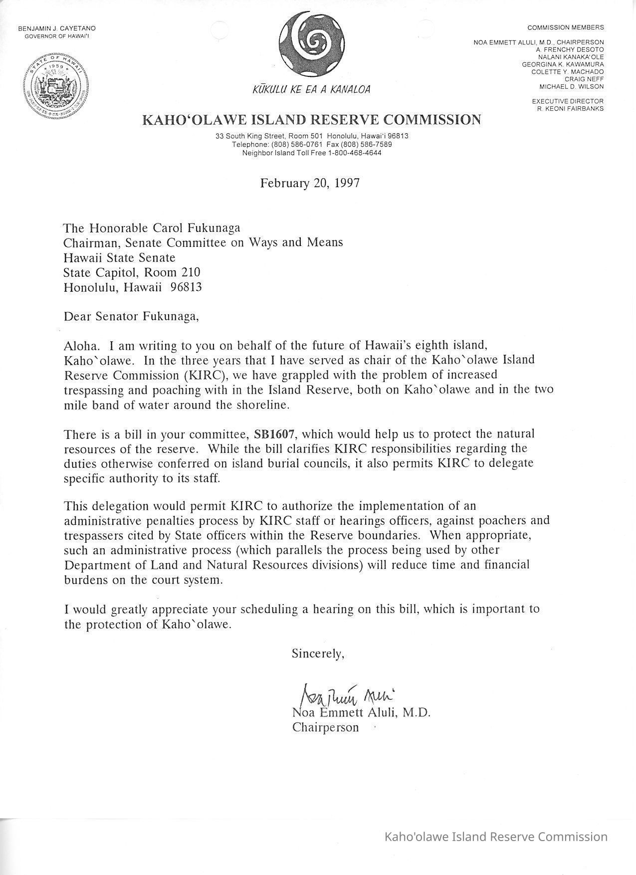 Letter to The Honorable Carol Fukunaga, Chairman, Senate Committe on Ways and Means, Hawaii State Senate from Noa Emmett Aluli, M.D, Chairperson of the Kahoo'olawe Island Reserve Commission regarding hearing on SB 1607.Creator