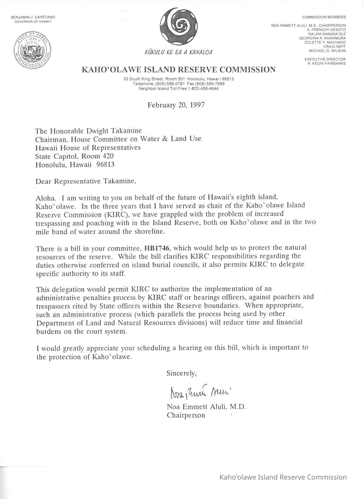 Letter to The Honorable Dwight Takamine, Chairman, House Committee on Water & Land Use regarding HB 1746 from Noa Emmett Aluli, M.D., Chairperson, Kaho'olawe Island Reserve Commission. Dr. Aluli requested a hearing on HB1746.Collection
