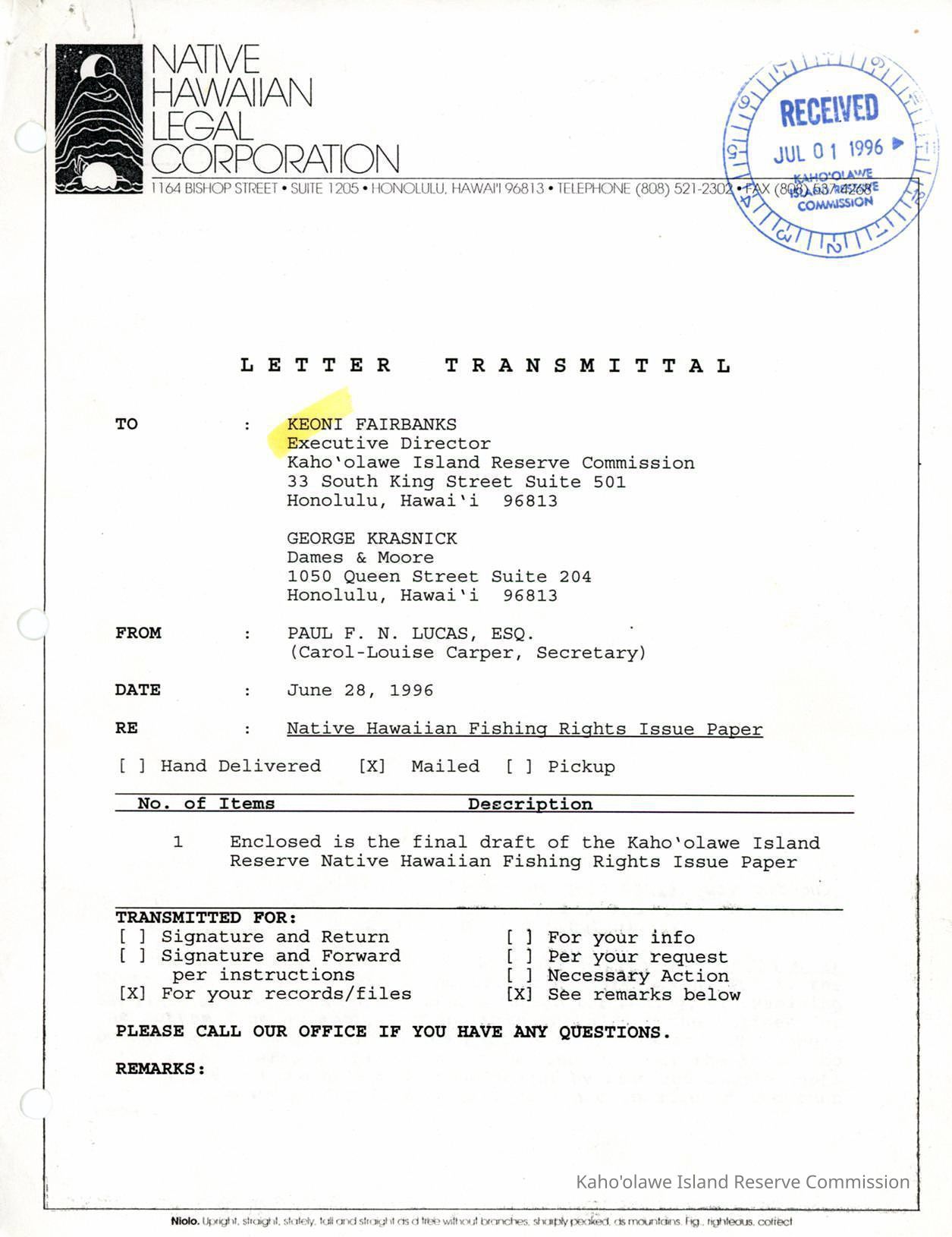 Letter transmittal to Keoni Fairbanks, Executive Director, Kahoolawe Island Reserve Commission/George Krasnick, Dames & Moore from Paul F. N. Lucas, Esq. re: Native Hawaiian Fishing Rights Issue Paper.Creator