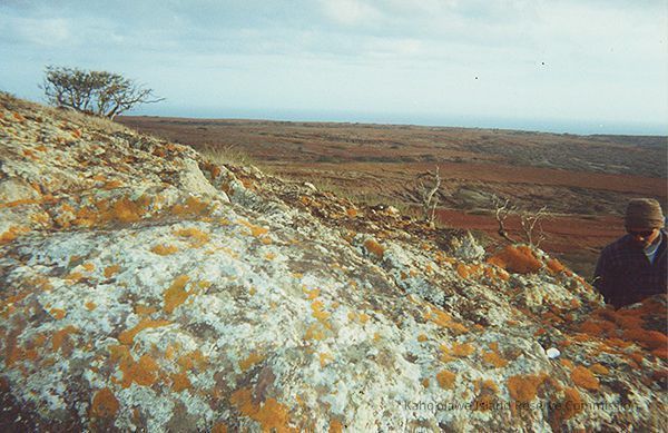 Color photo of lichen on sides of pohaku (large boulder) with unidentified person on far right side and tree in back. Hard pan is in the background.Collection