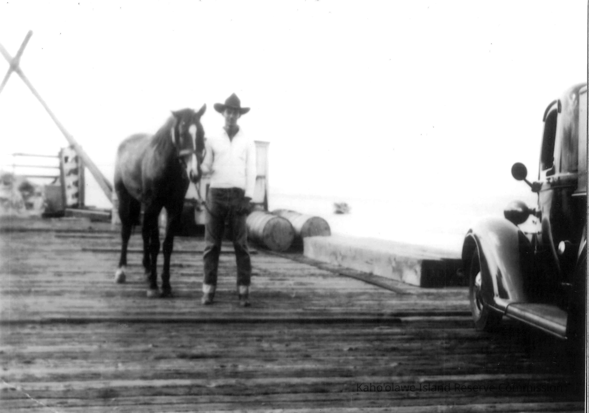 Digital image of black & white print of Louis Coelho on old Kihei Wharf going to Kahoolawe with horses.