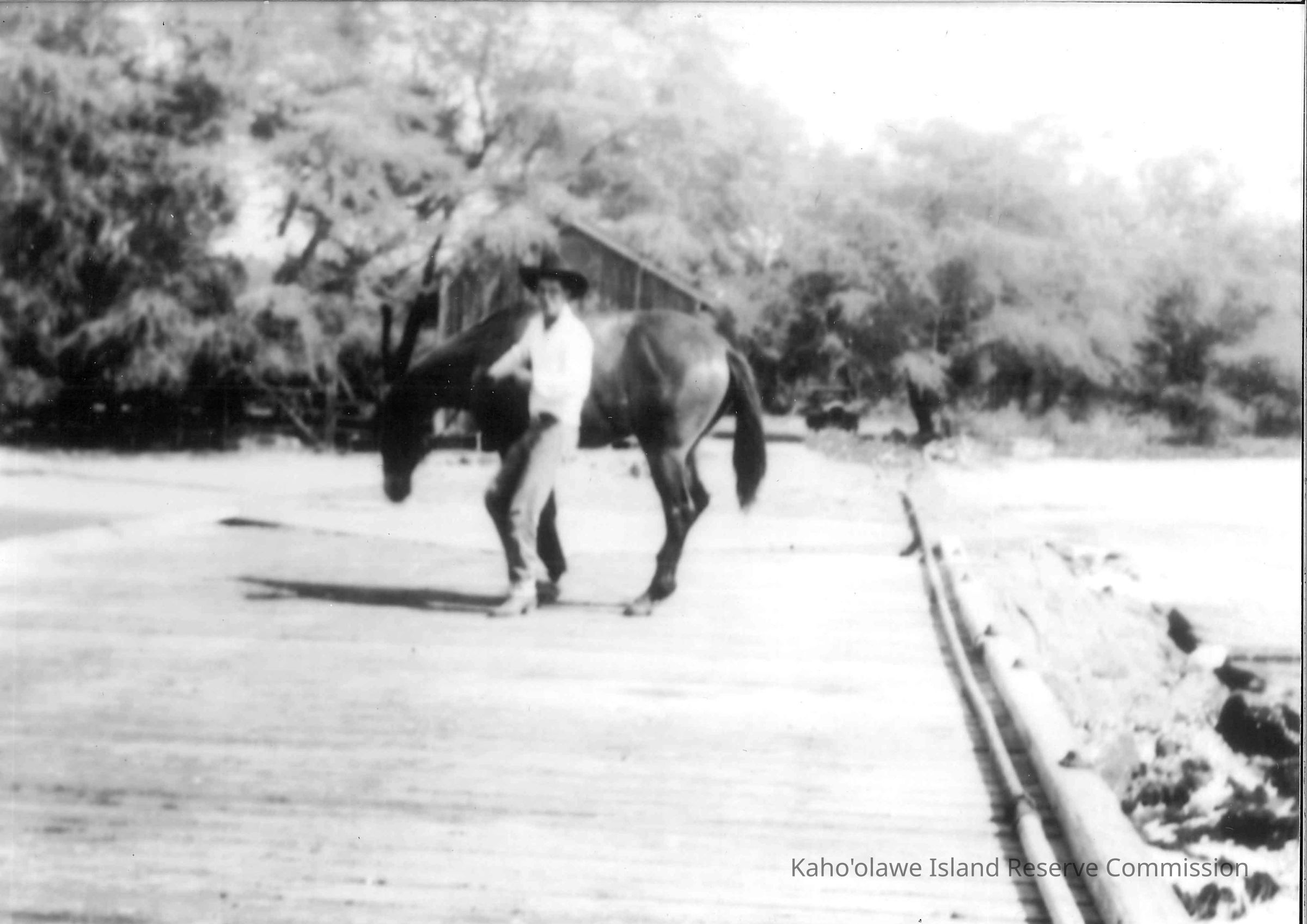 Digital image of black & white print of Louis Coelho getting ready to load his horse on the boat to go to Kaho'olawe.Photograph Details