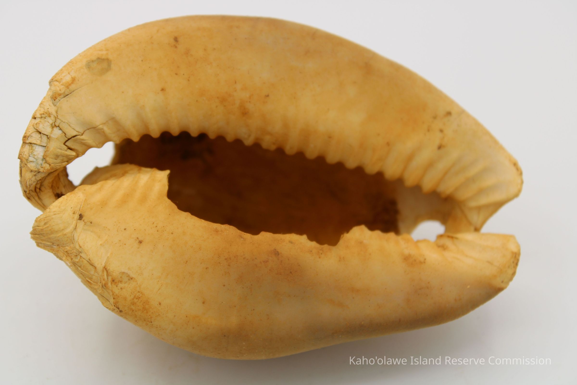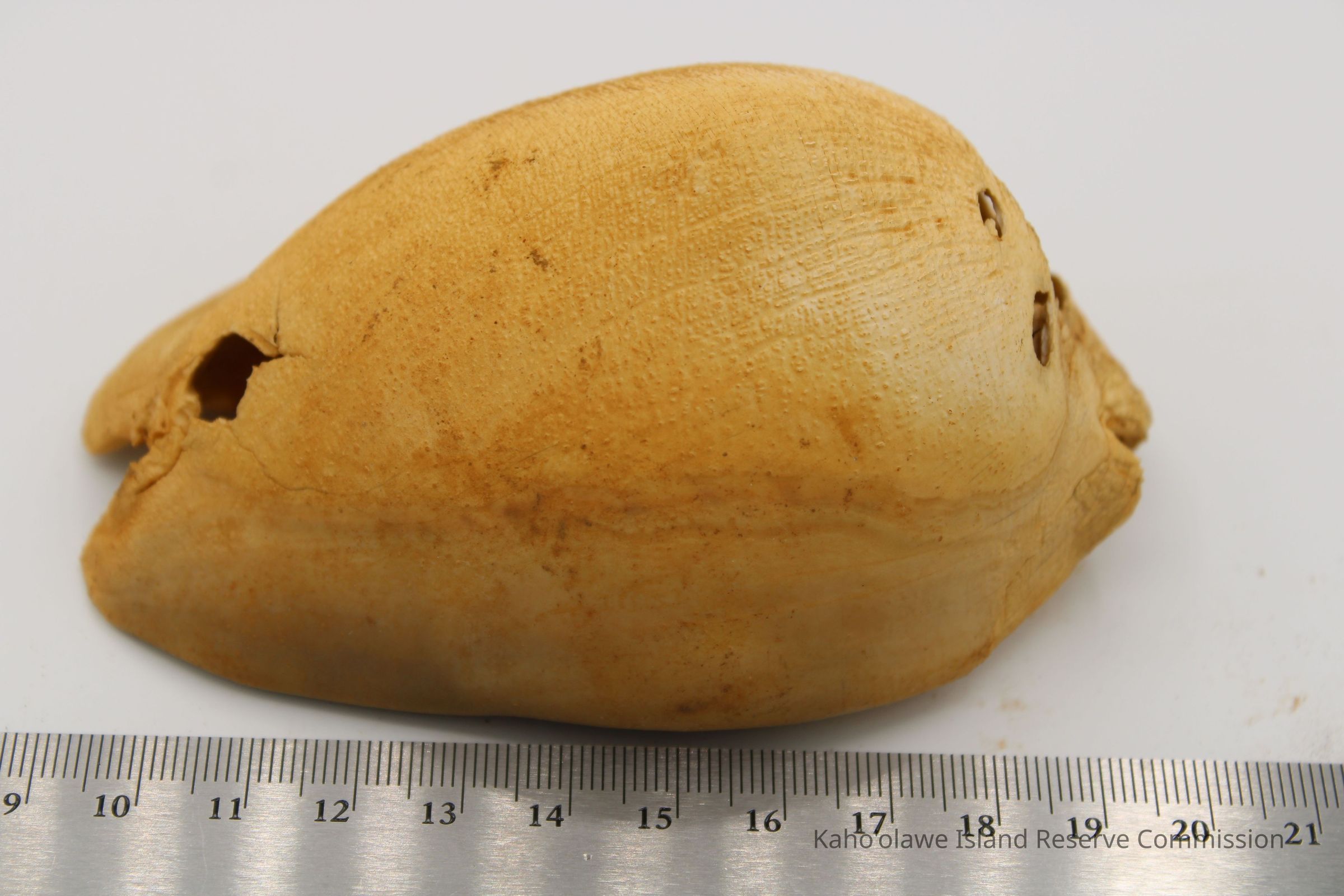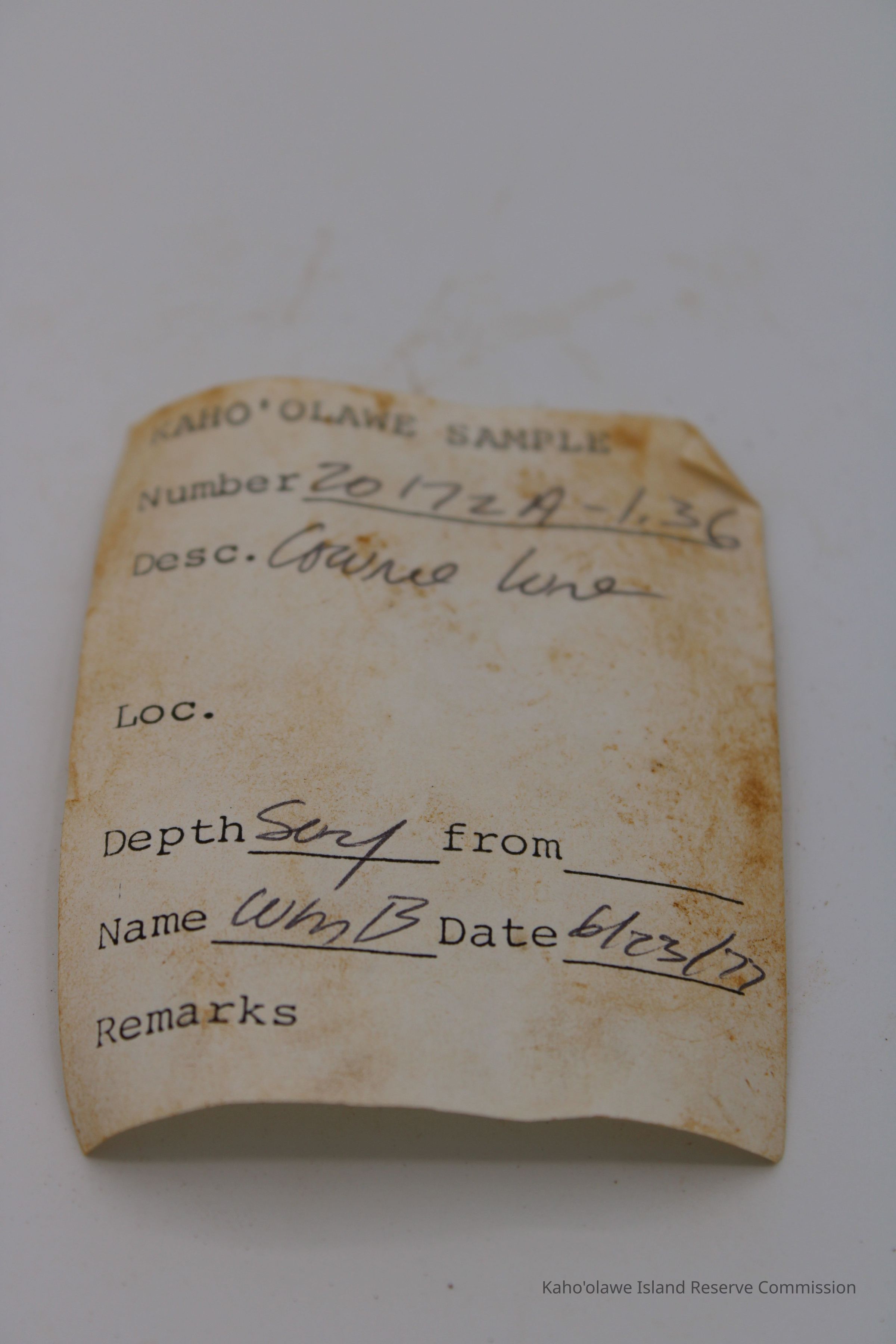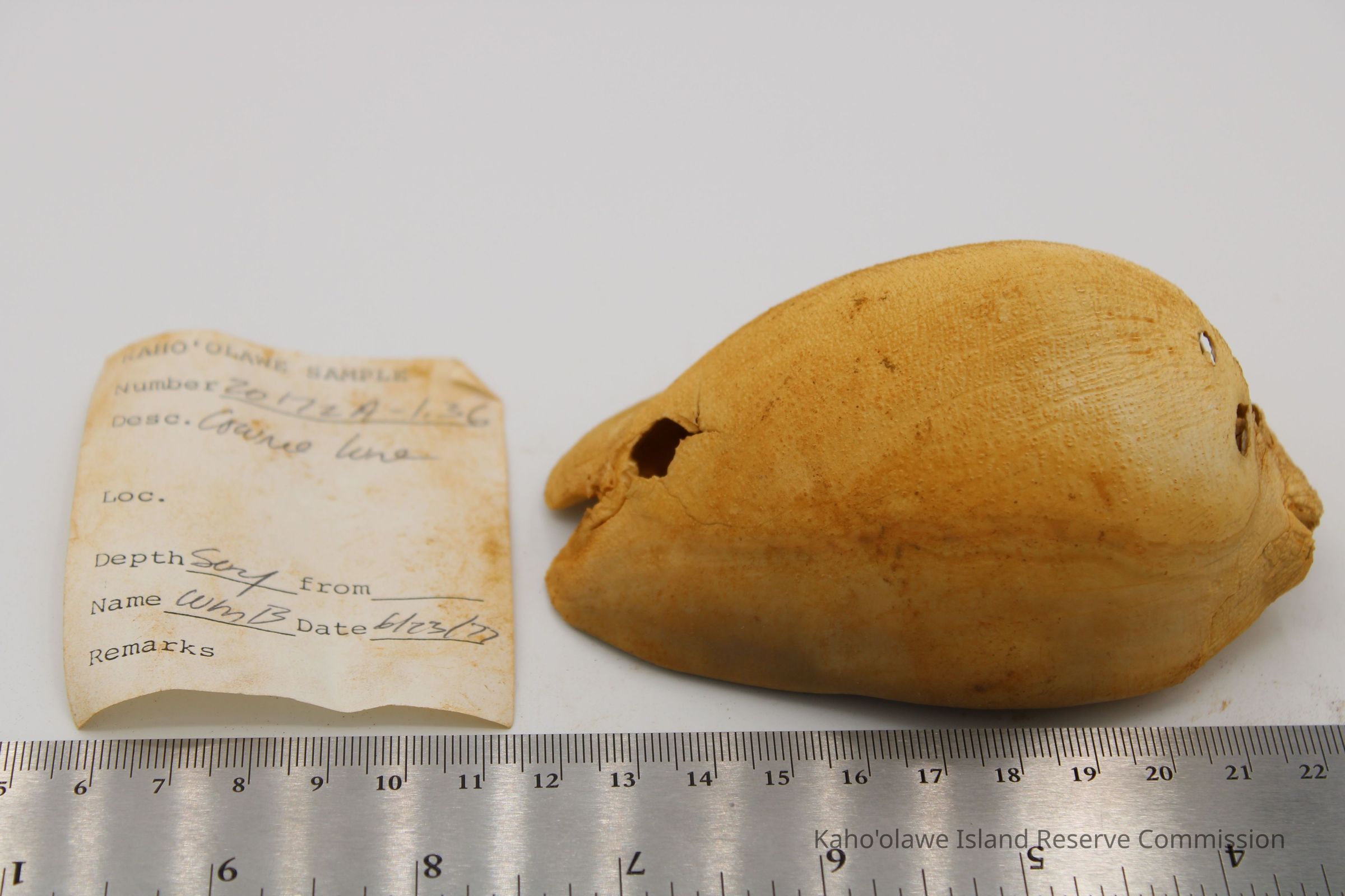 The image shows a cowrie shell lure next to a ruler for scale and an accompanying form detailing sample information and collection date.