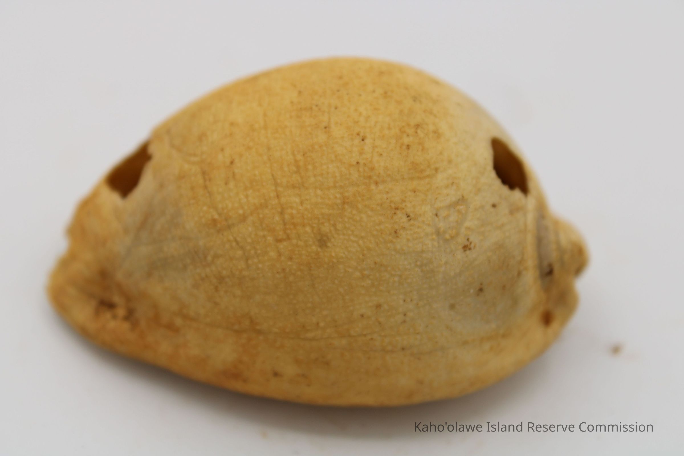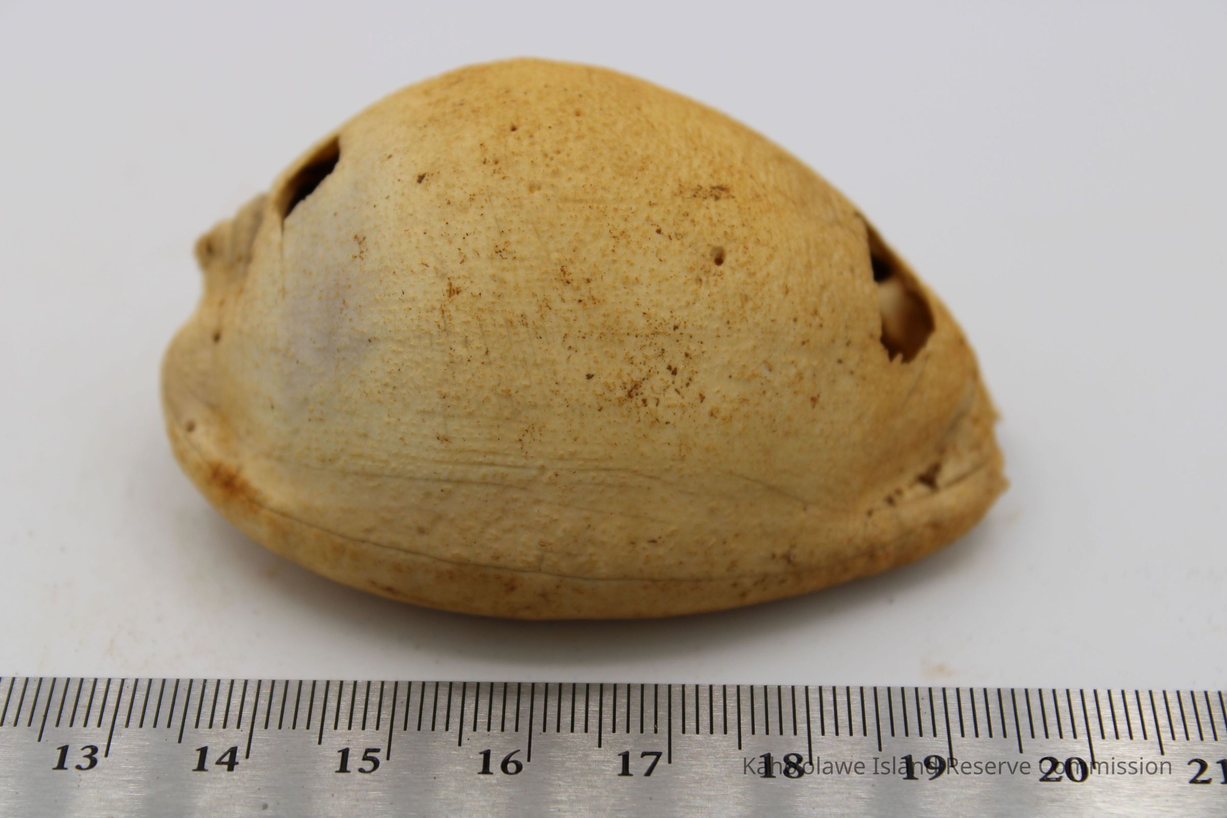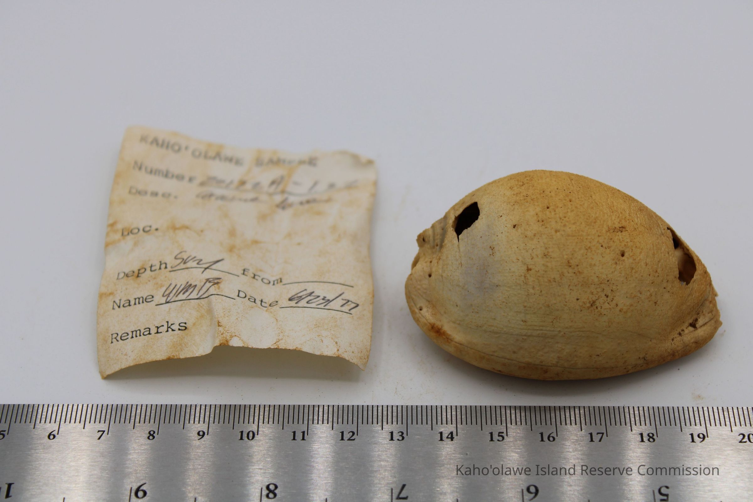 The image shows a cowrie shell lure next to a weathered note, lying beside a ruler for scale.