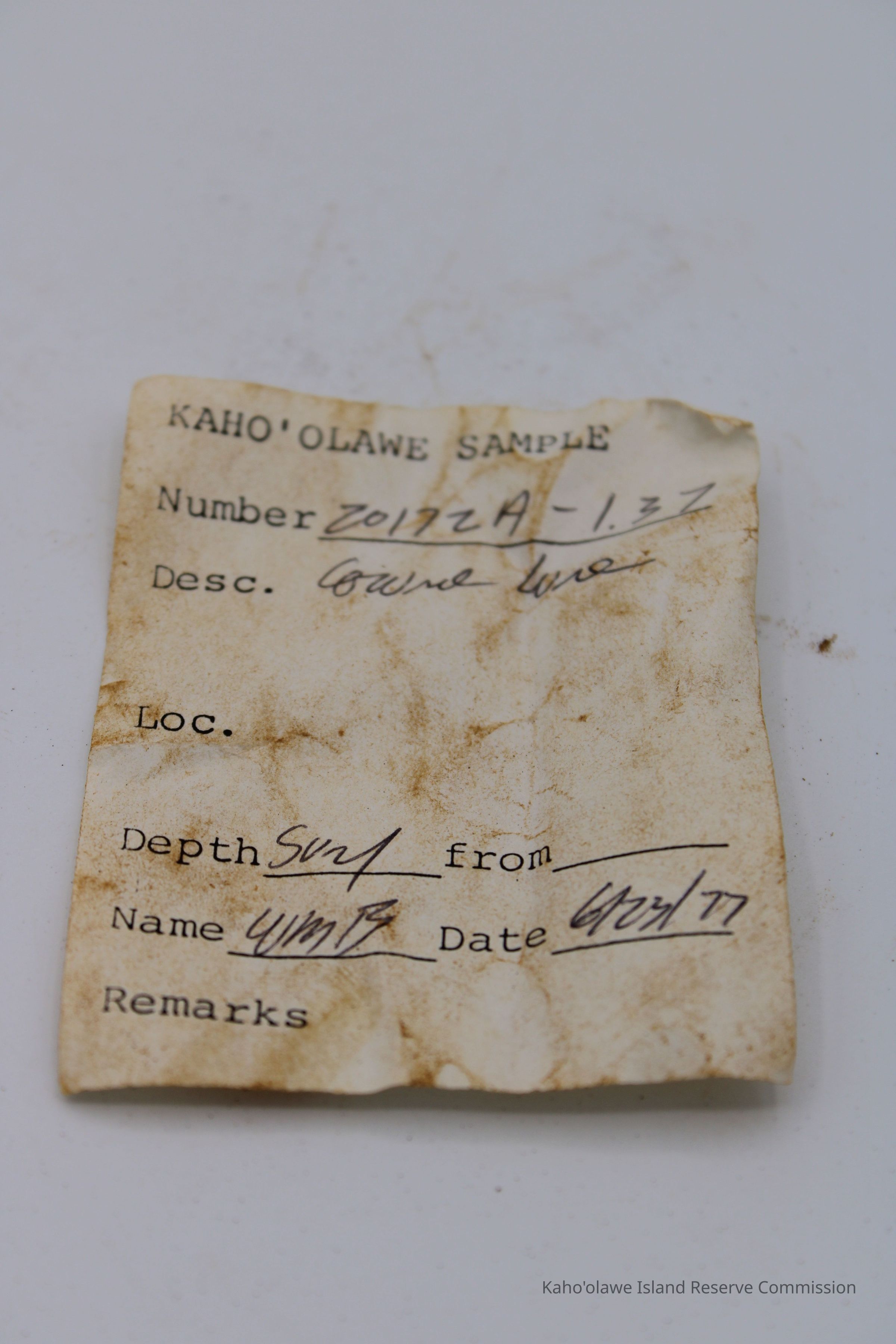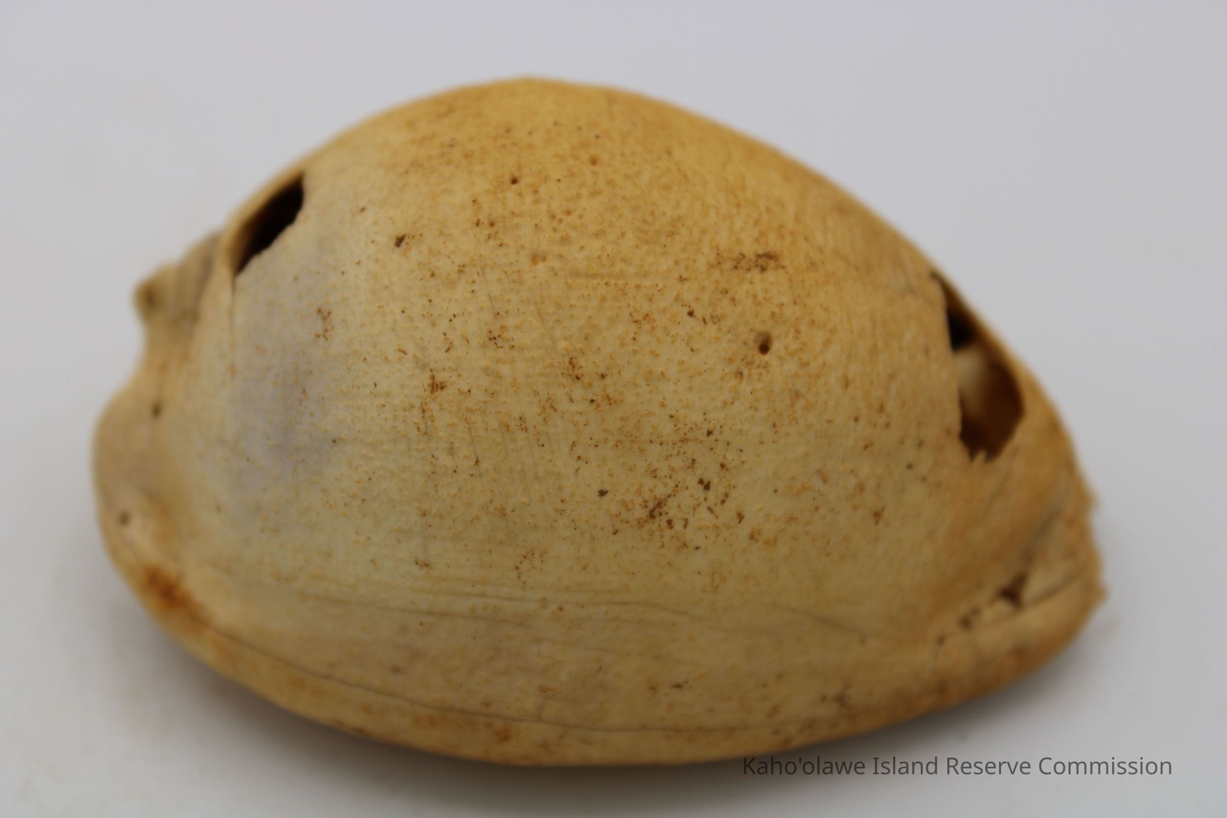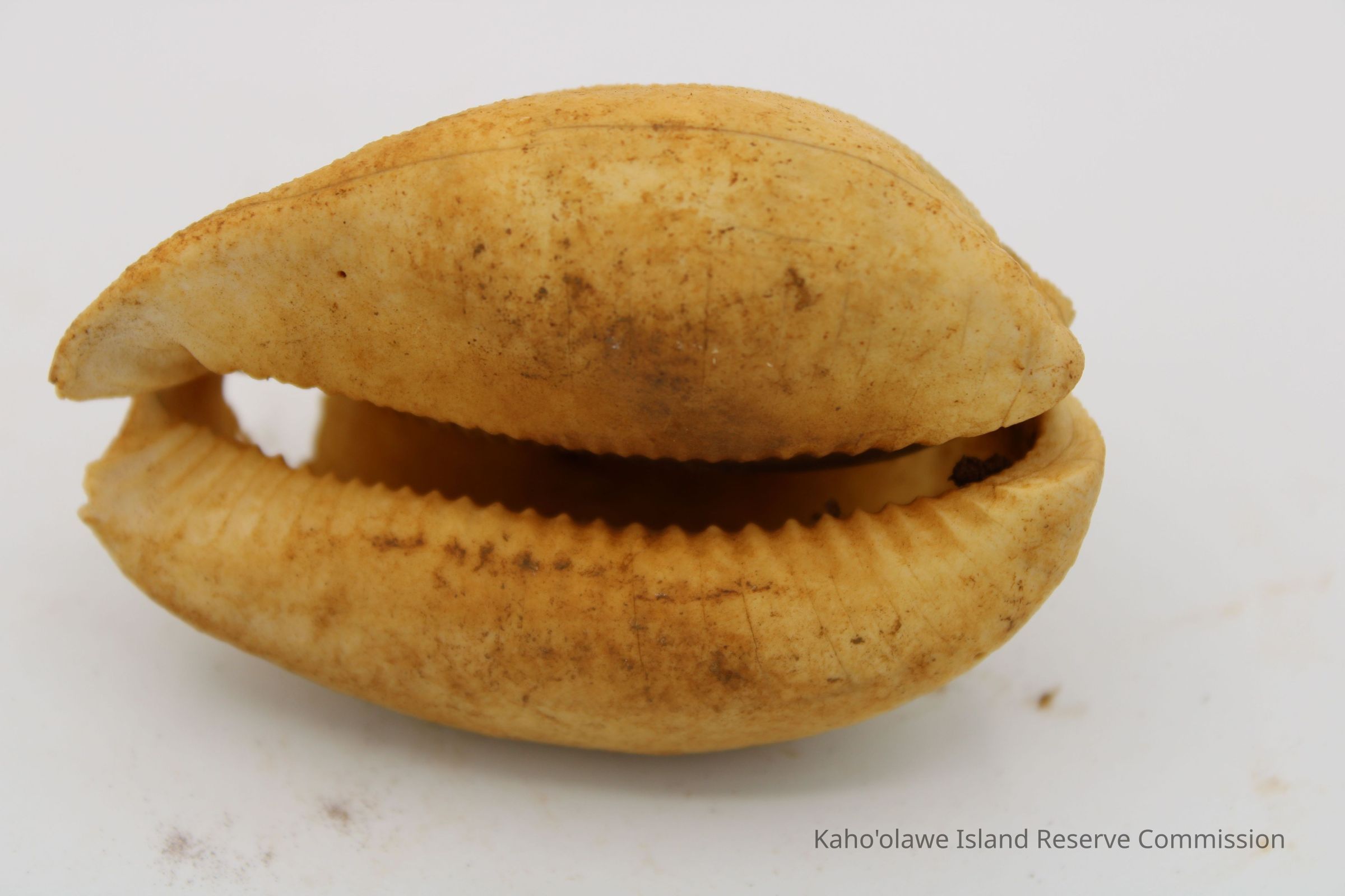 The image shows a cowrie shell lure next to a weathered note, lying beside a ruler for scale.