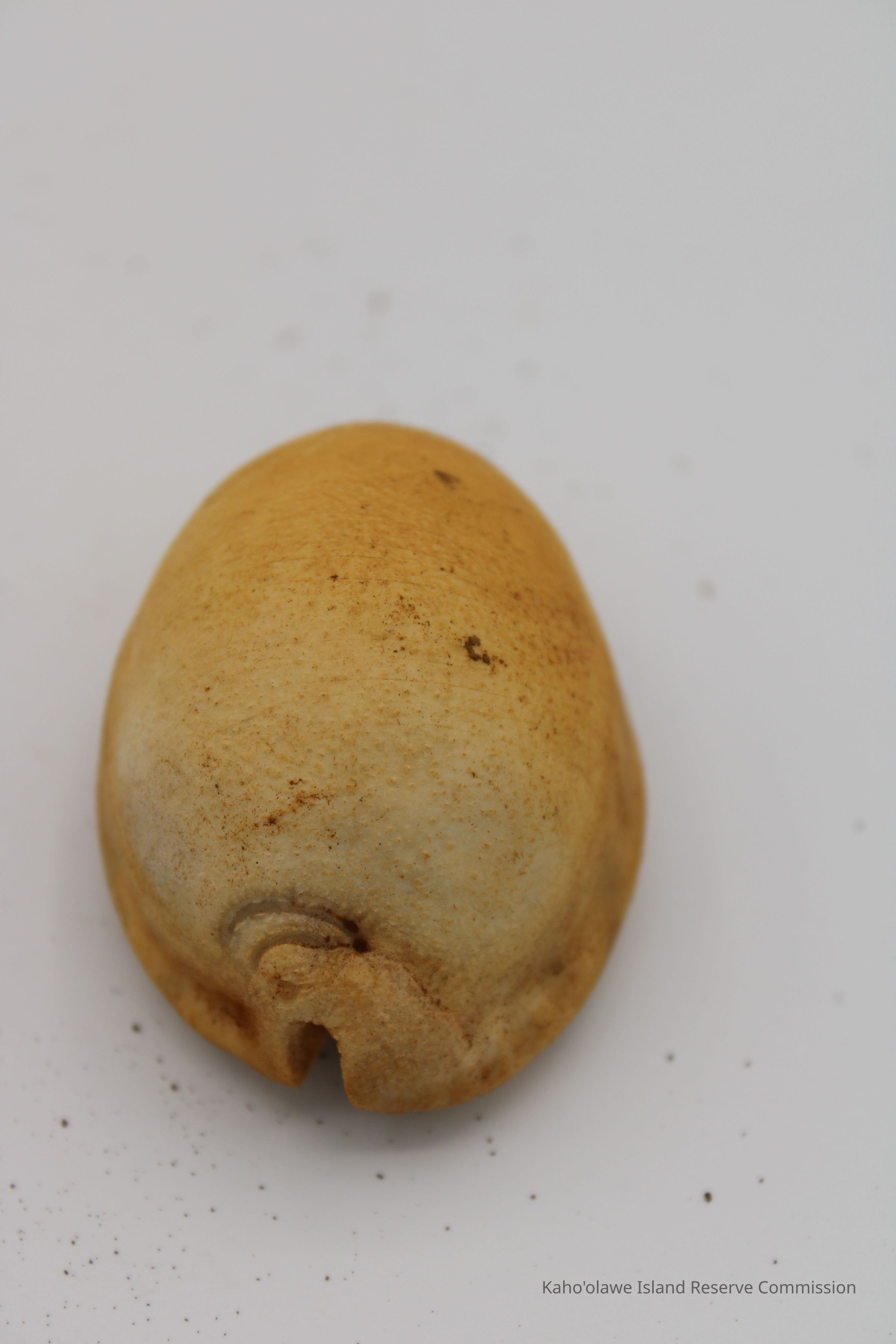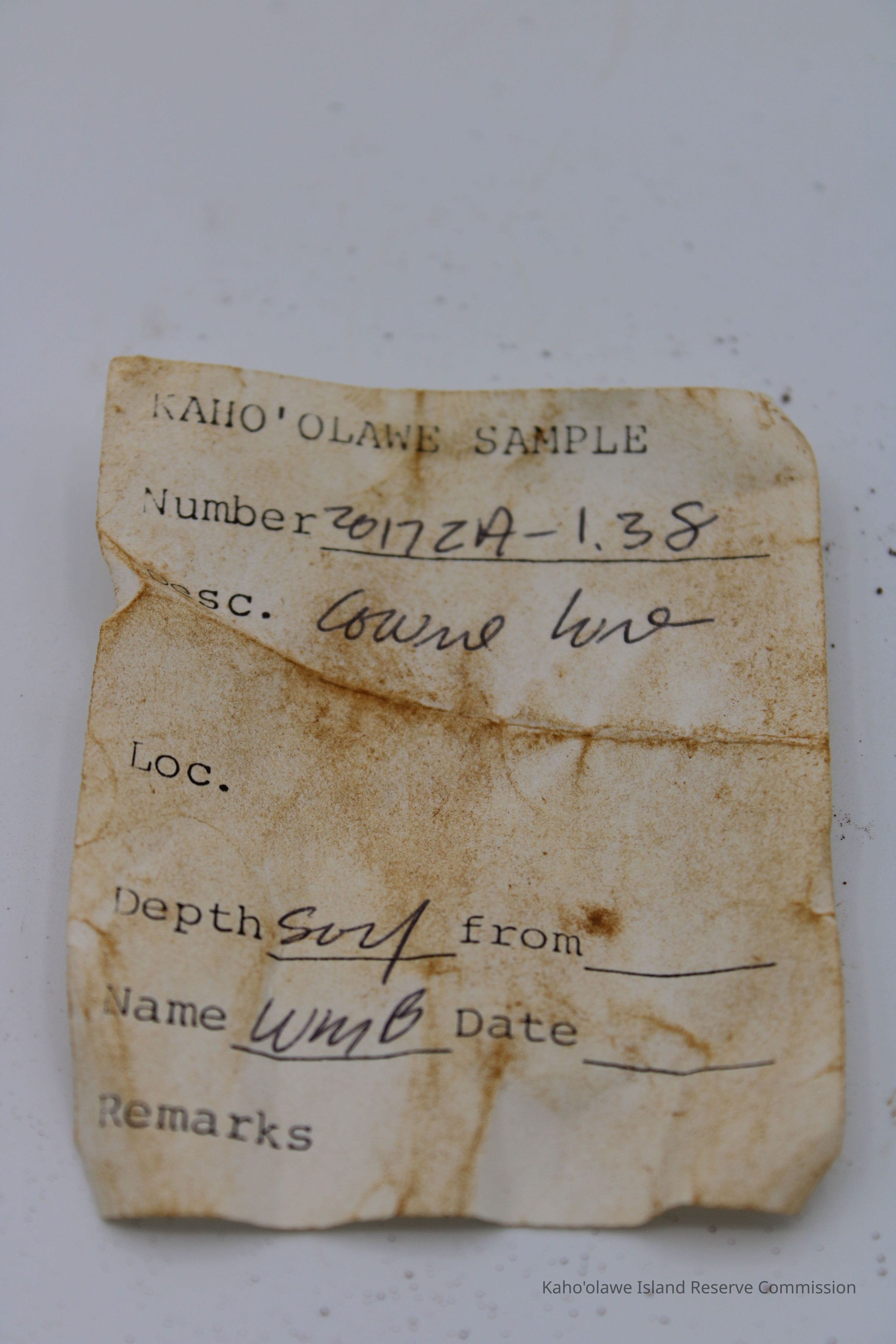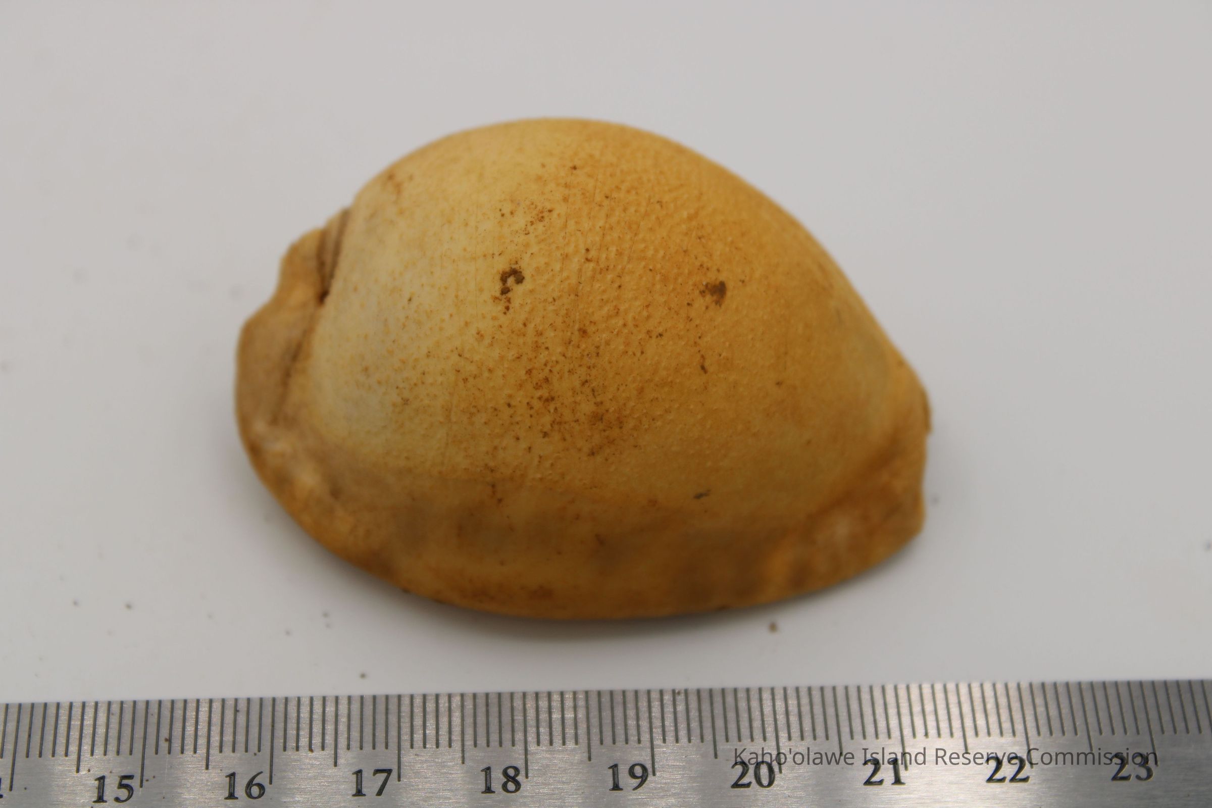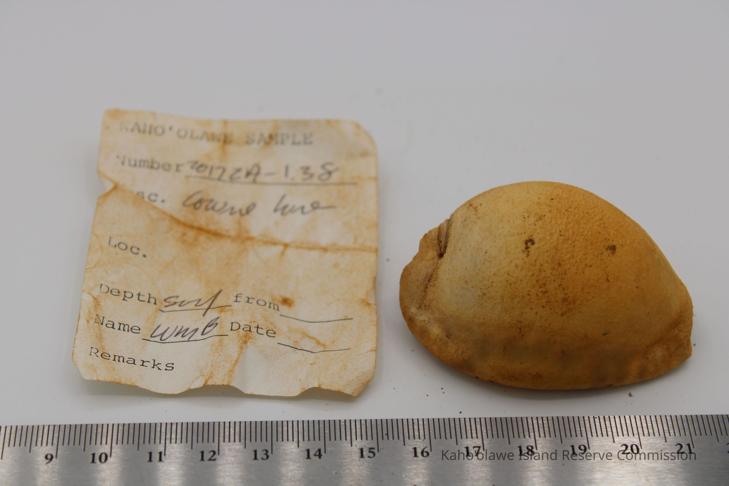 The image shows a cowrie shell lure next to a worn, handwritten label with measurements showing depth and date information.