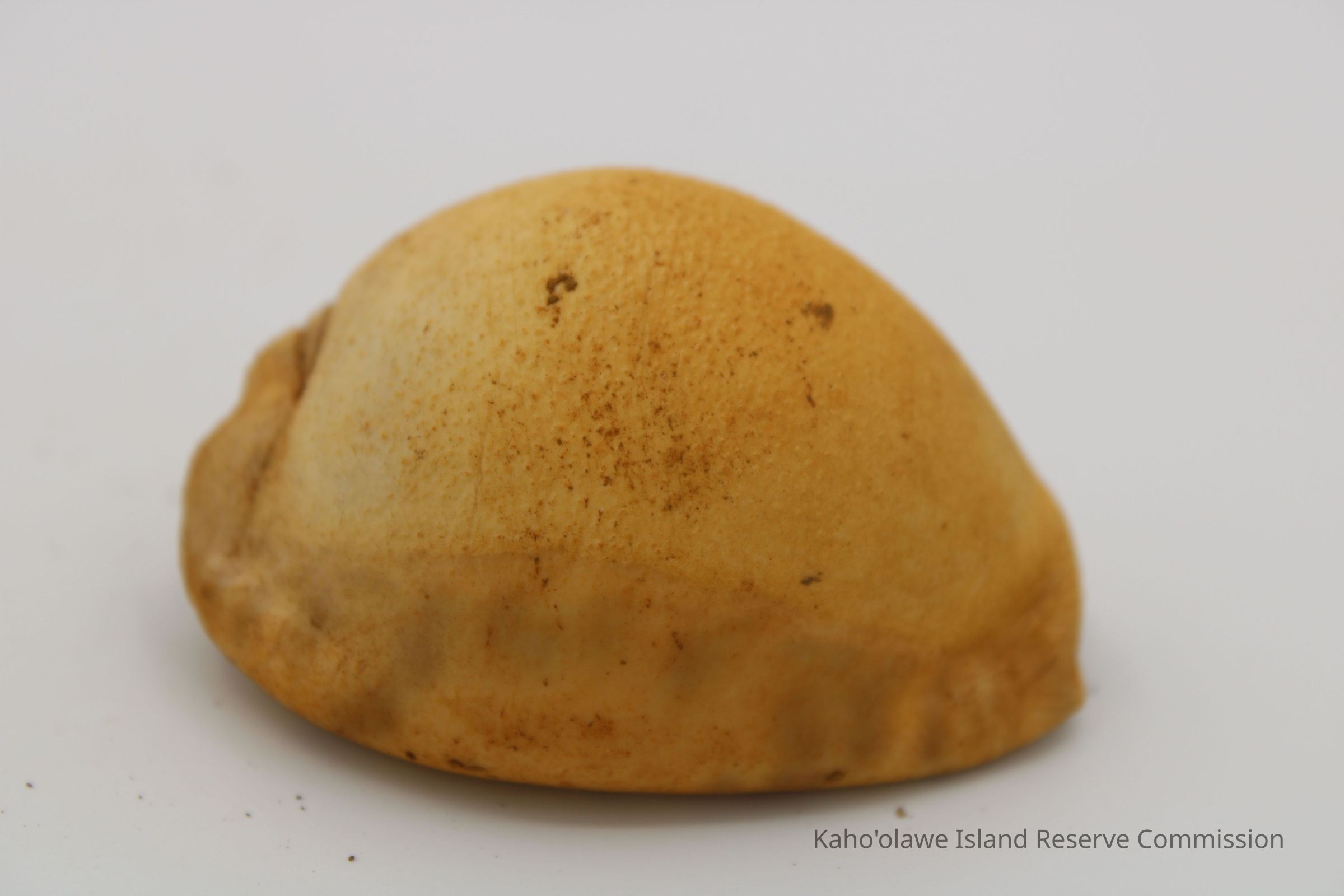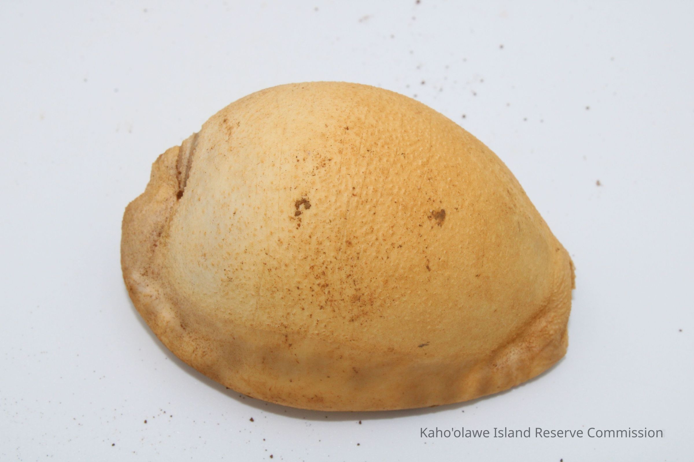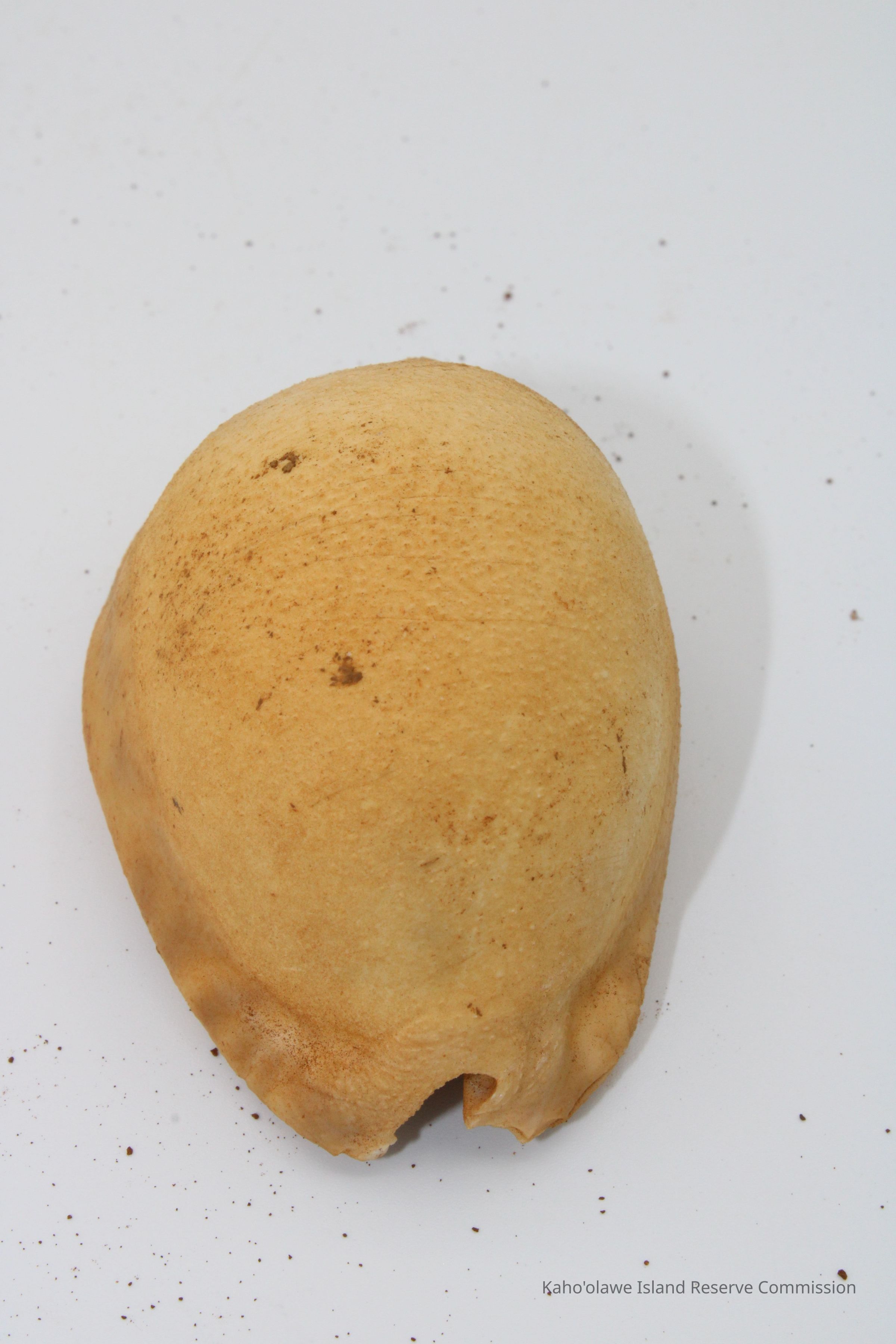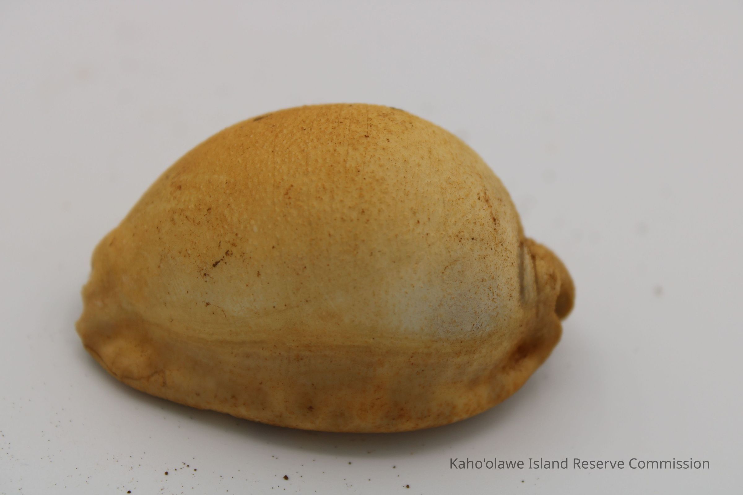 The image shows a cowrie shell lure next to a worn, handwritten label with measurements showing depth and date information.