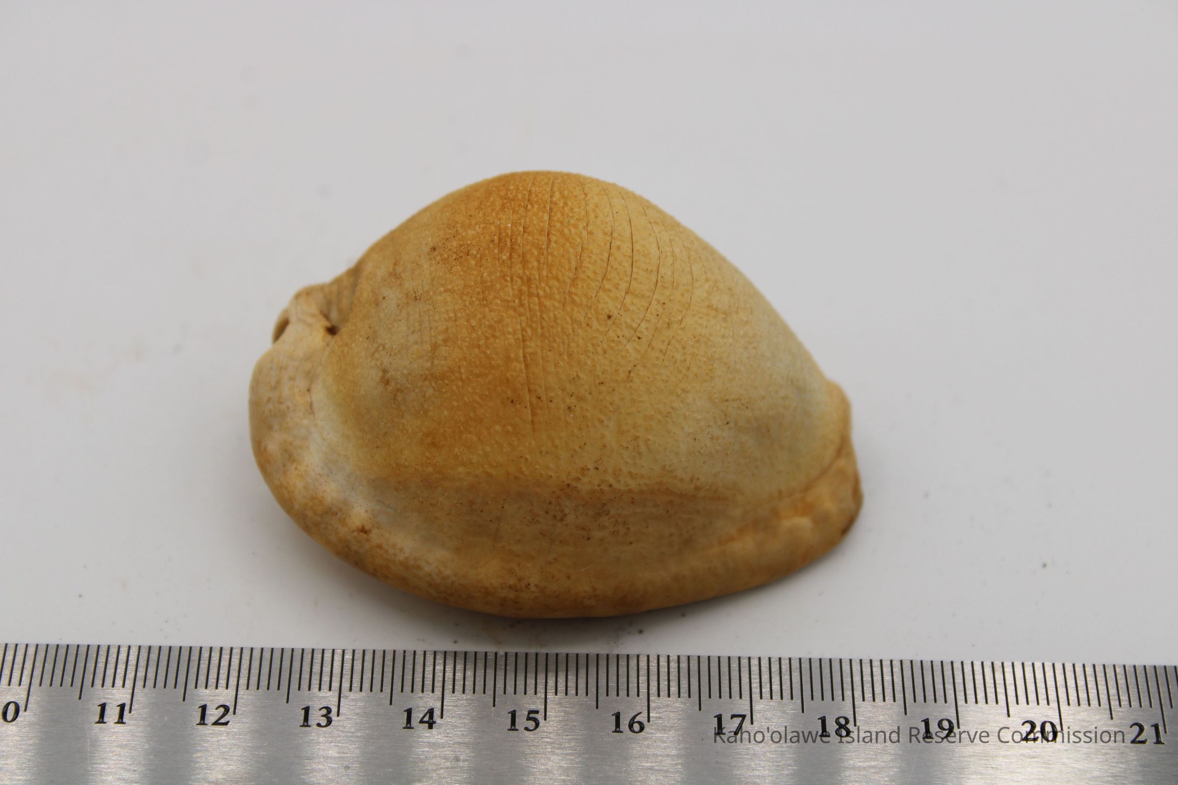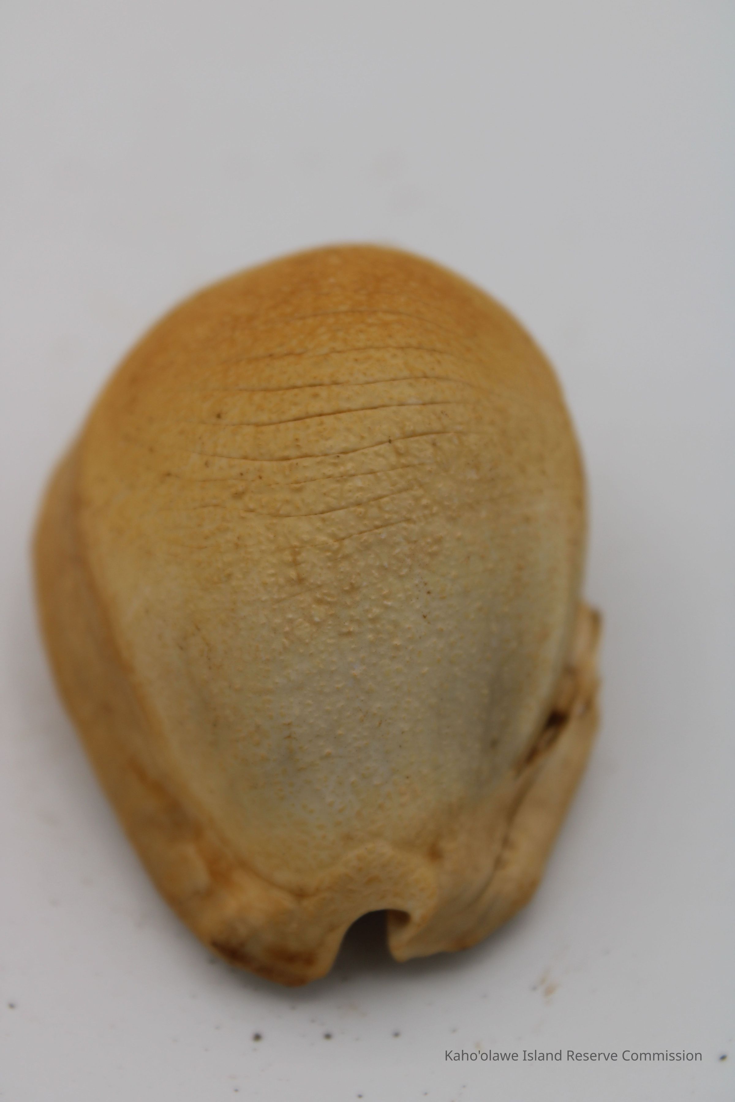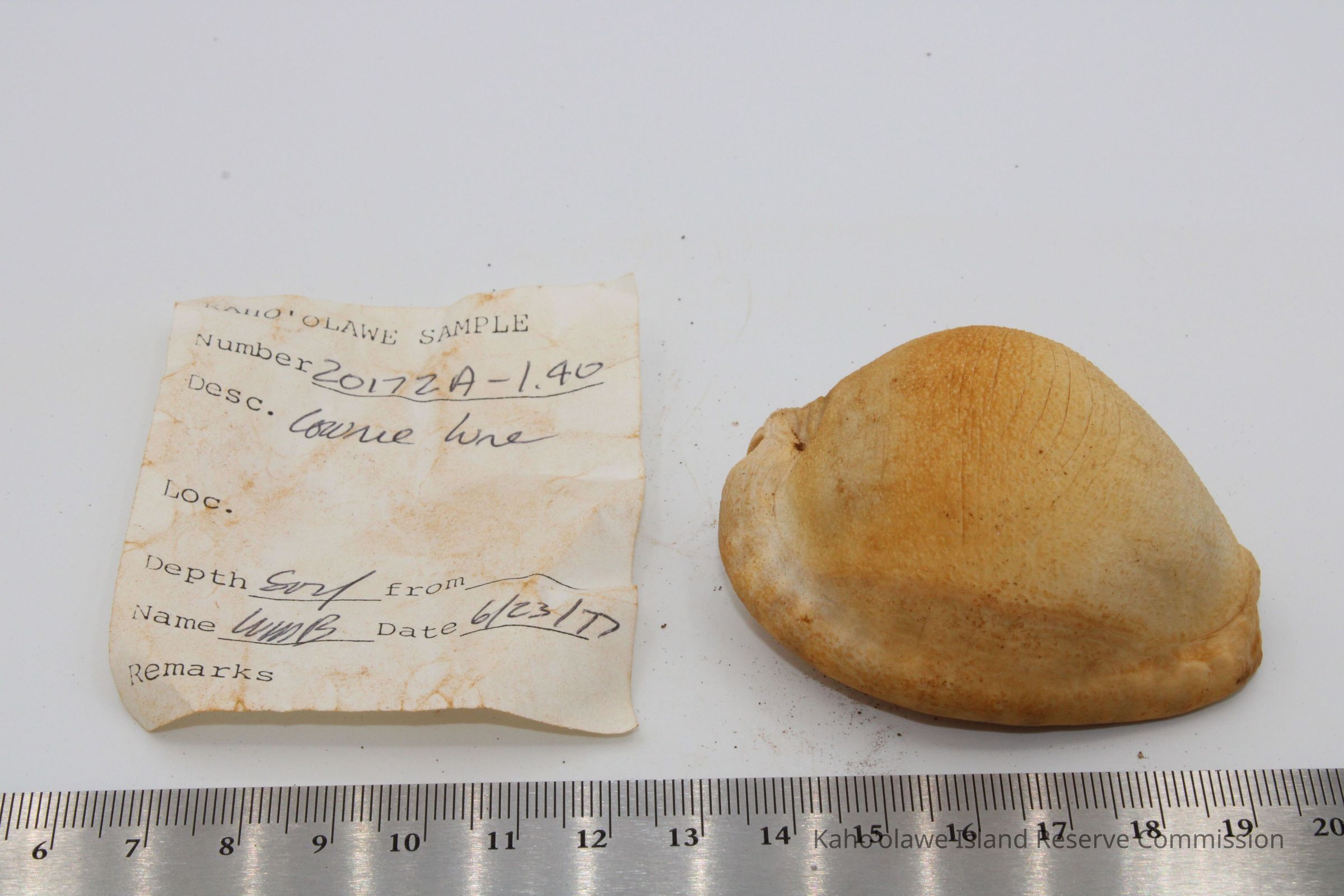 Intact cowrie shell lure. Artifact slip and sample collection record state the object is a cowrie shell. However, there are no additional holes in it.