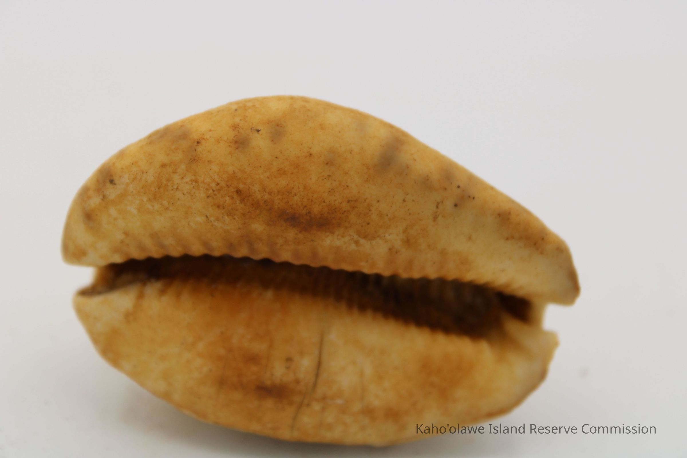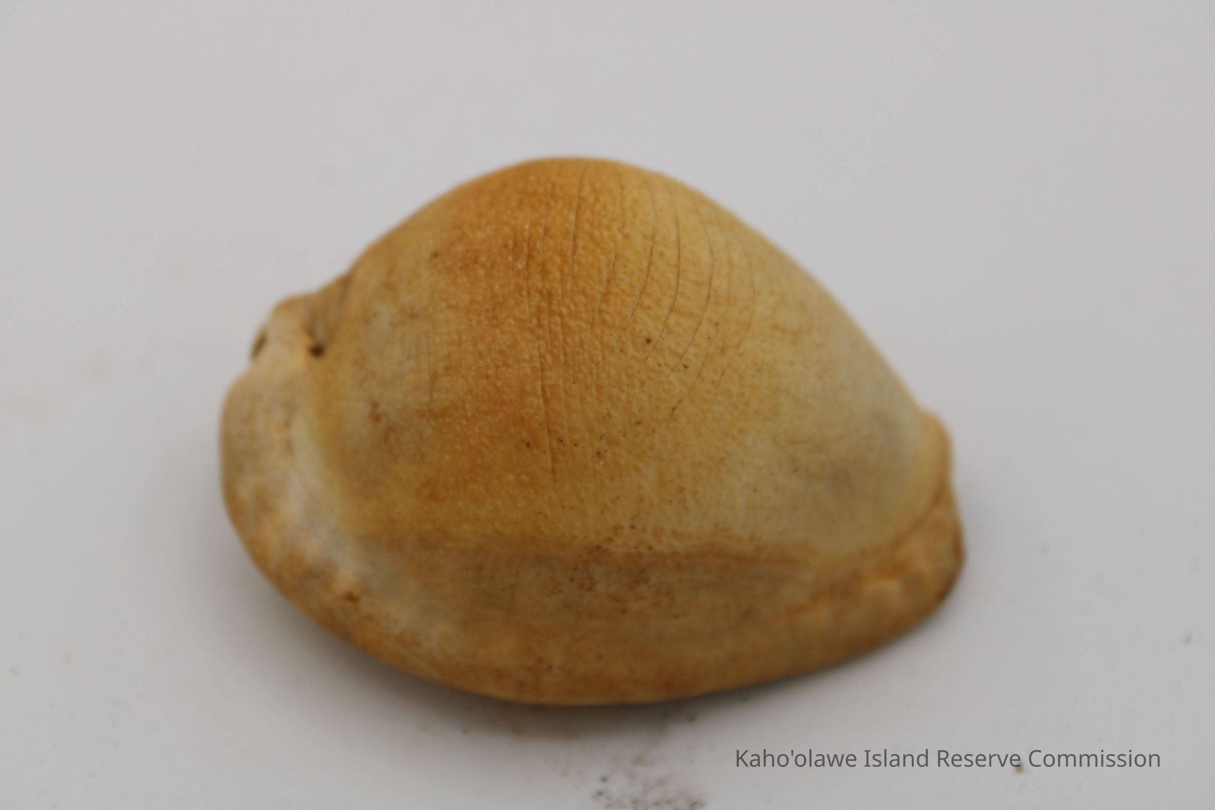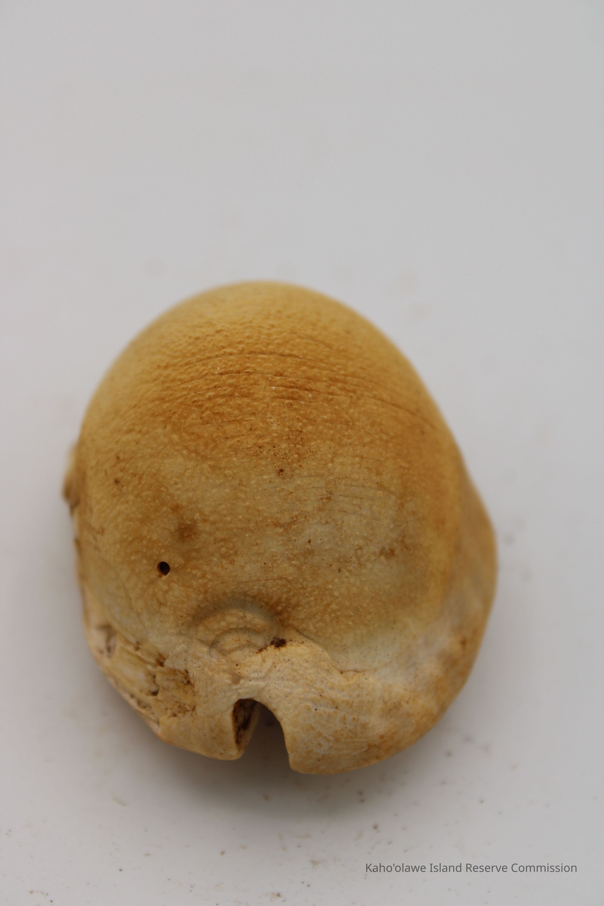 Intact cowrie shell lure. Artifact slip and sample collection record state the object is a cowrie shell. However, there are no additional holes in it.