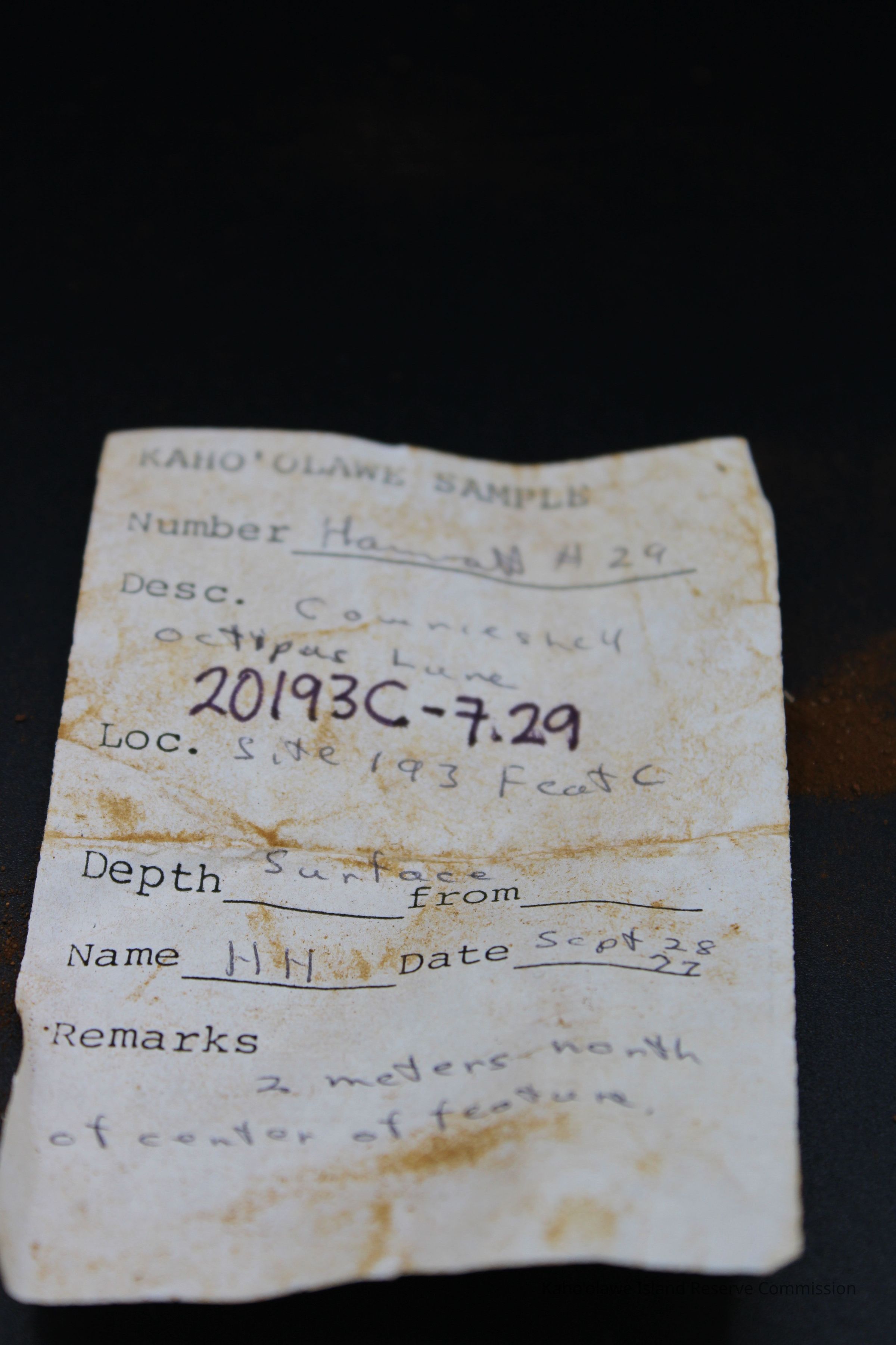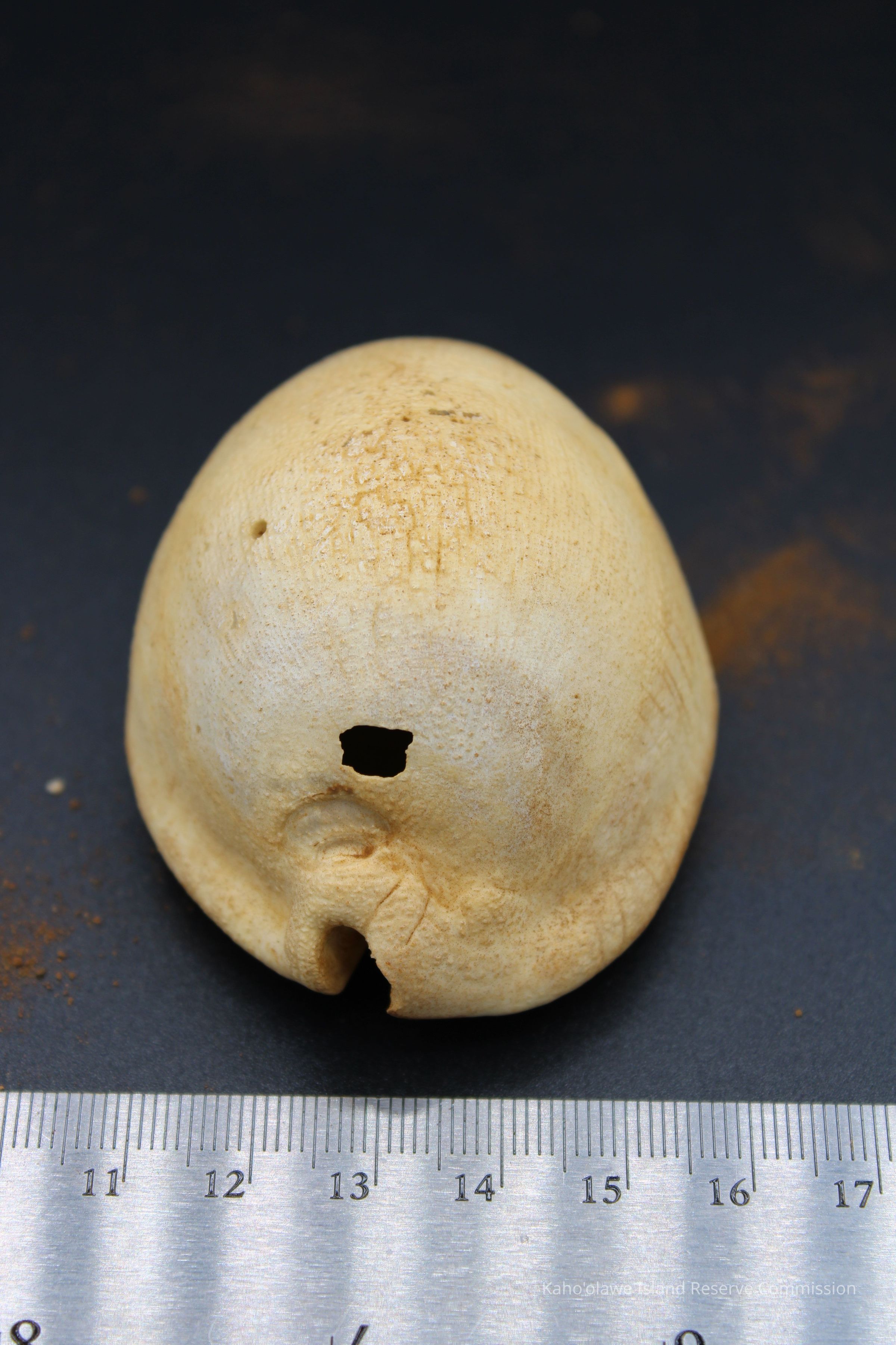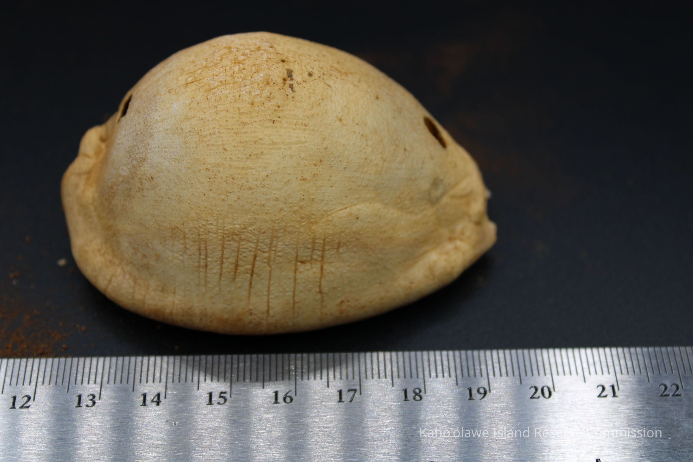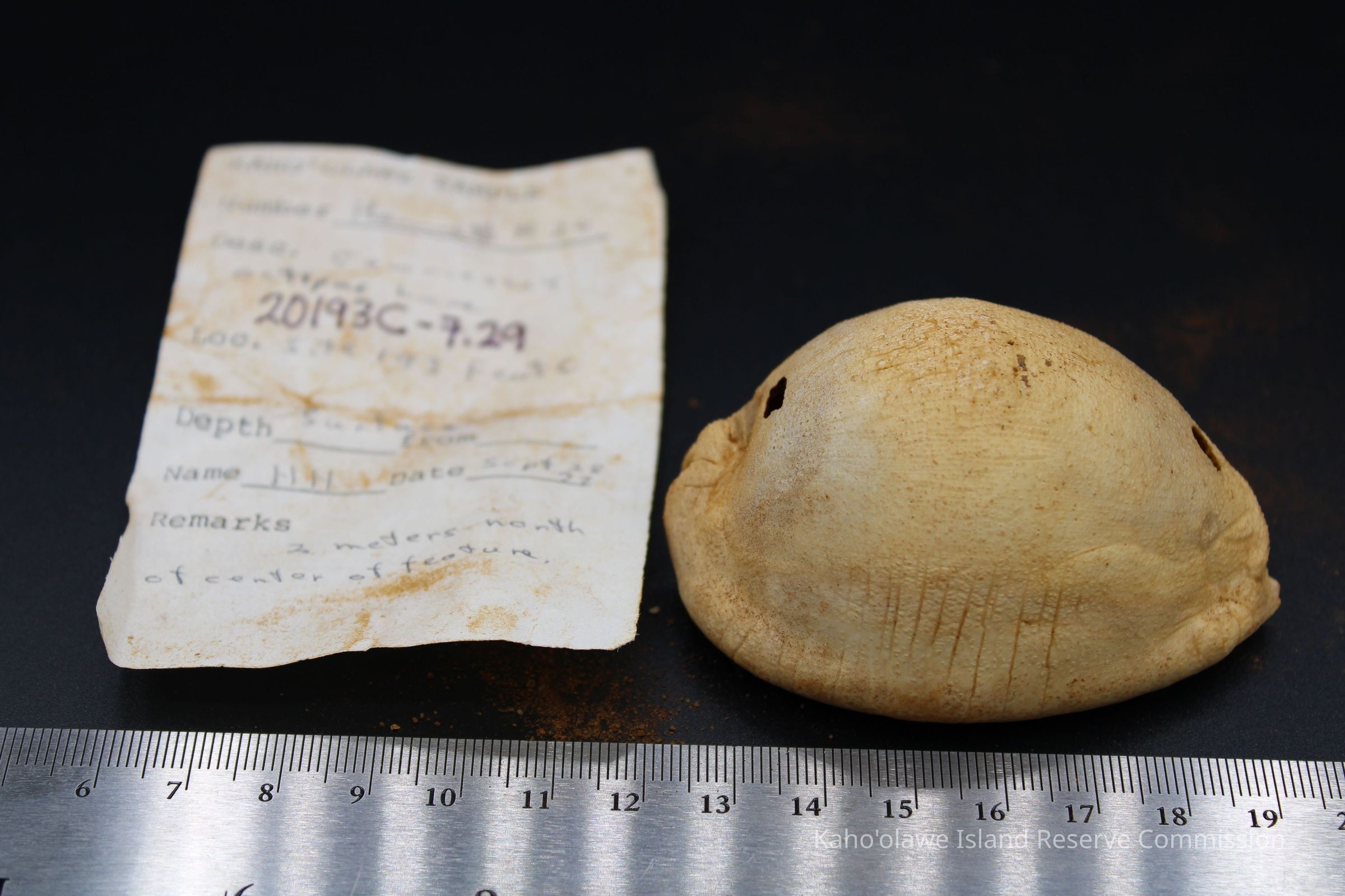 The image shows an aged shell lure beside a worn artifact slip with handwritten notes, placed alongside a metal ruler for scale.
