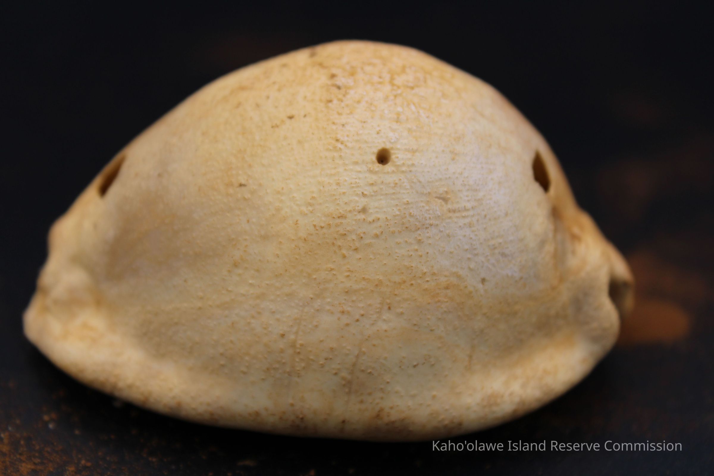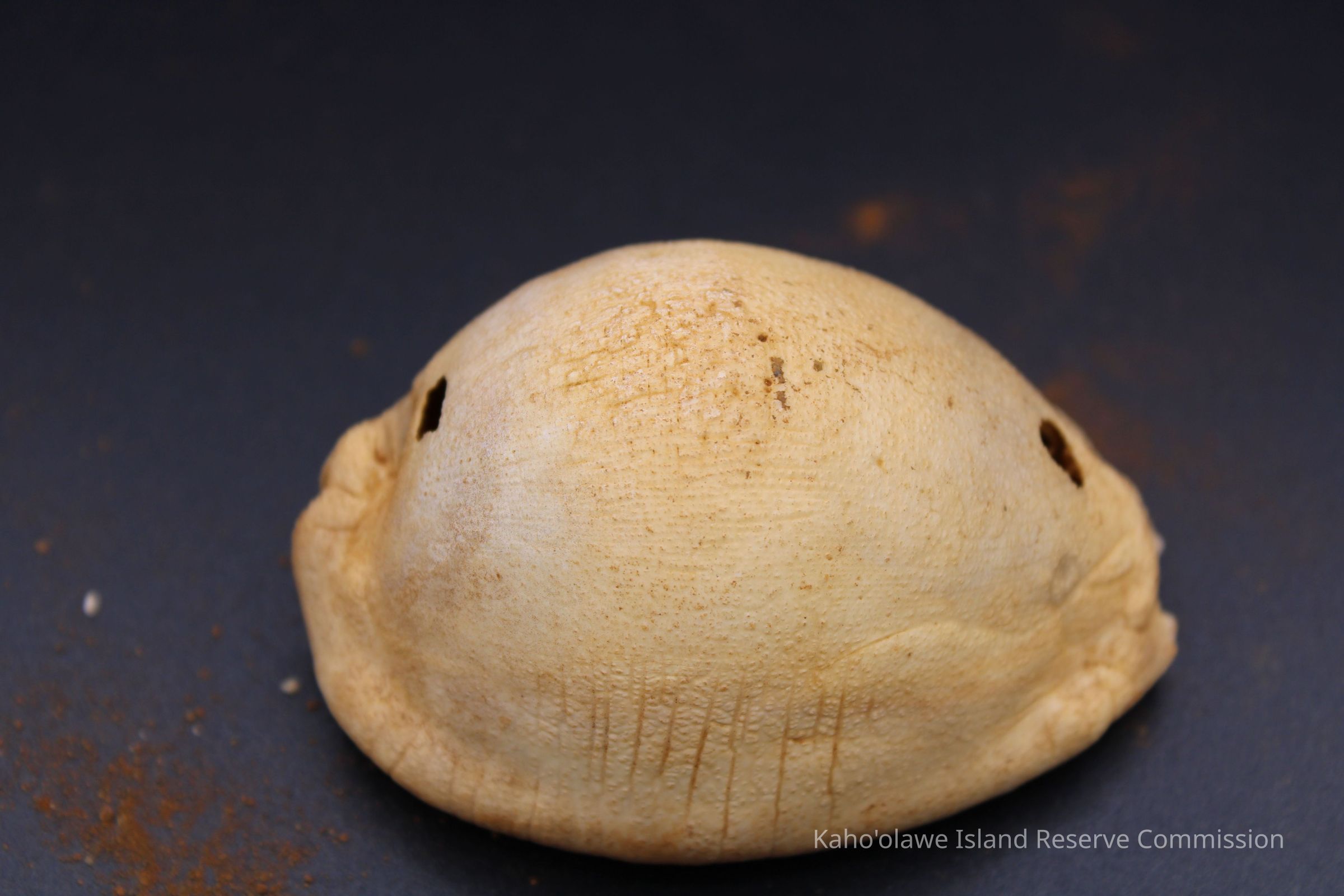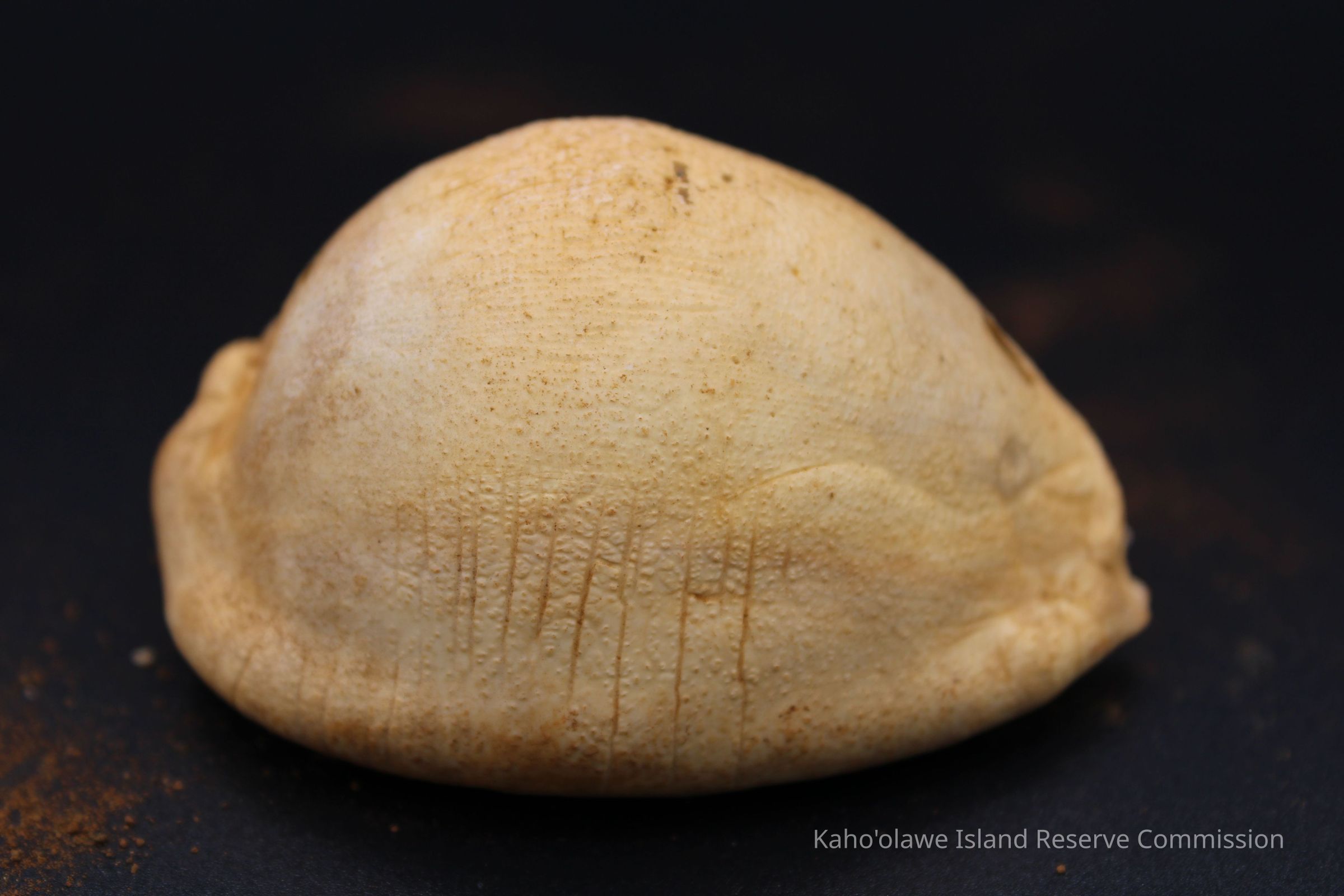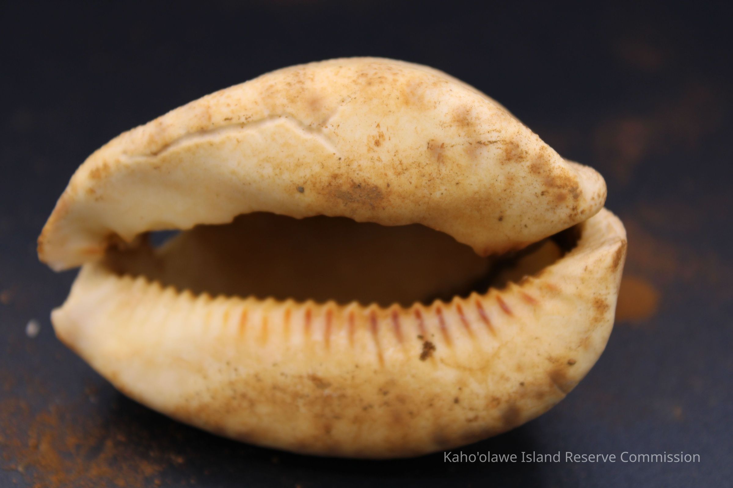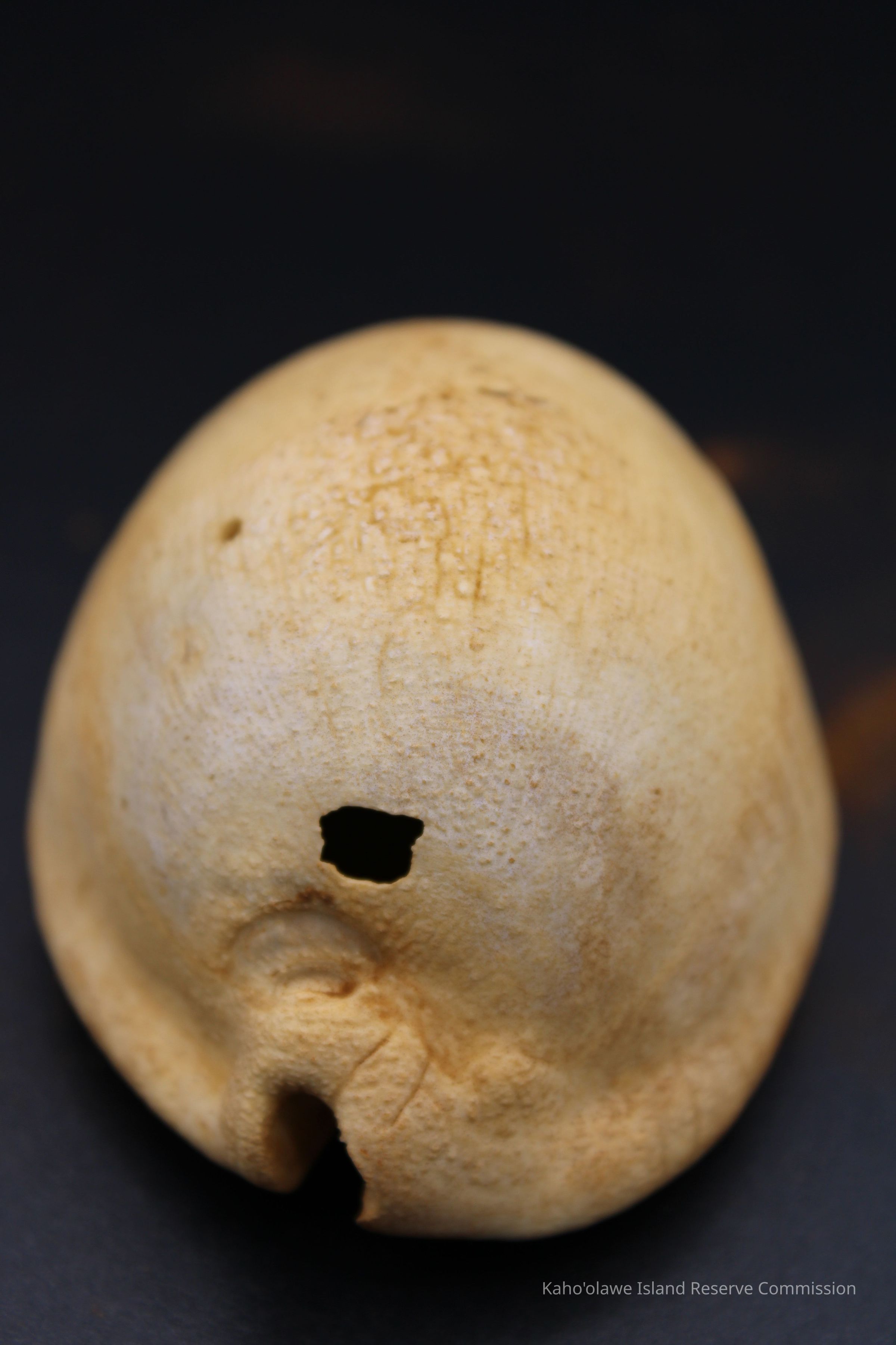 The image shows an aged shell lure beside a worn artifact slip with handwritten notes, placed alongside a metal ruler for scale.