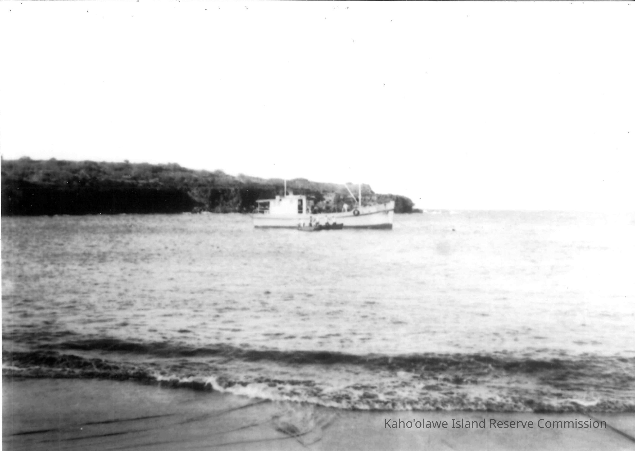 The image depicts a black and white photo of a medium-sized boat floating near a rocky coastal line under a clear sky.