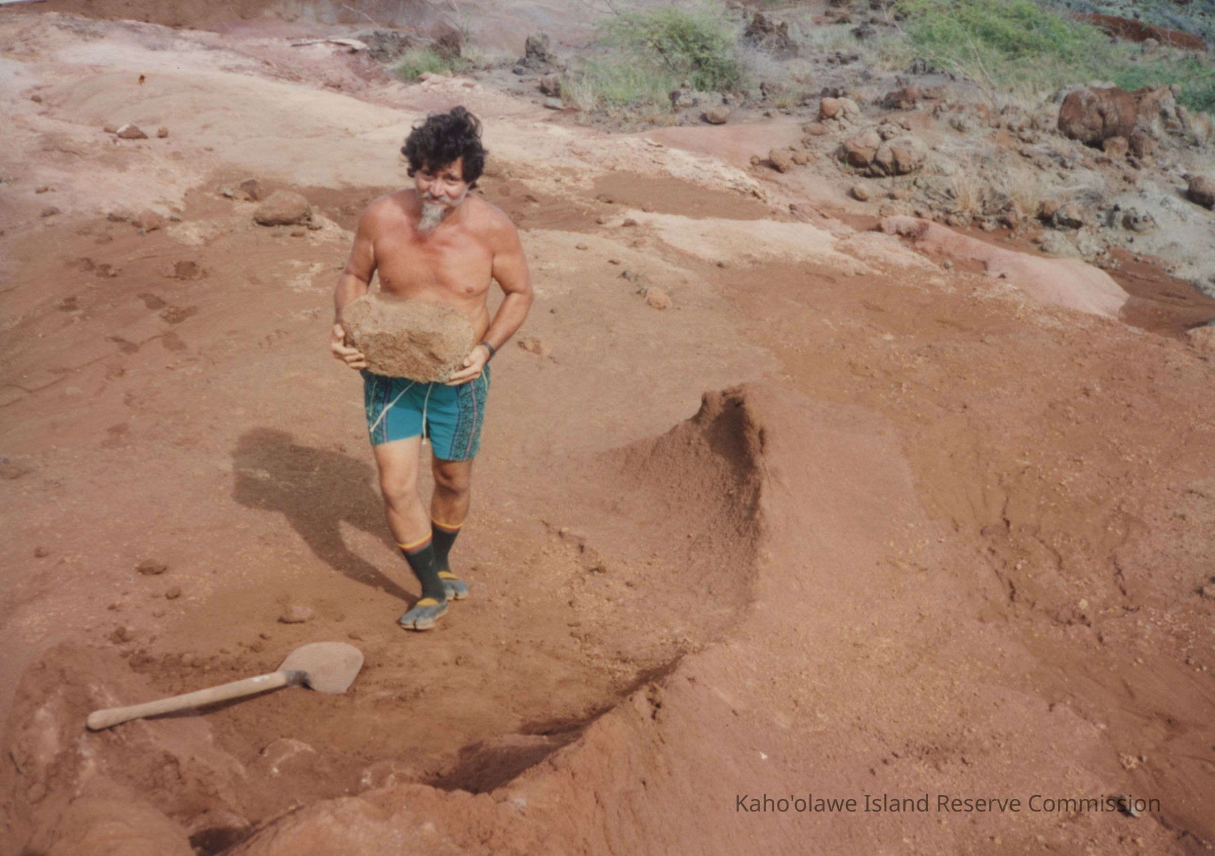Color photograph of an unidentified man carrying a large rock and standing on hardpan.