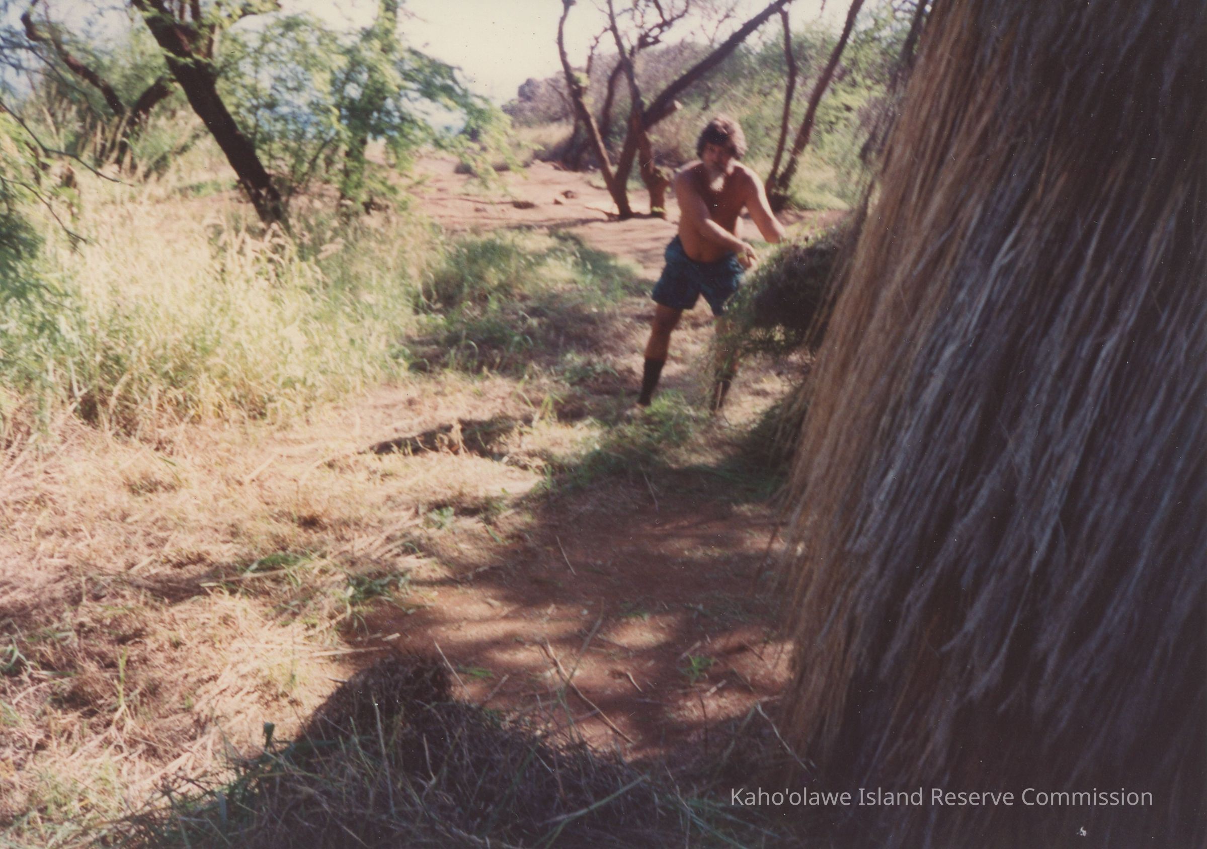 An unidentified man clearing out weeds. A hand-written notation was written on a page prior to the page originally storing this photo album. It reads "November 14-17 1993; Advance Crew Before Makahiki."